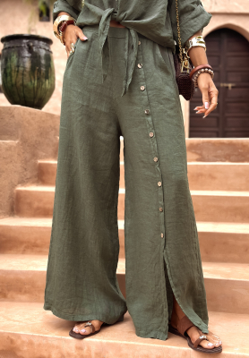Lniane spodnie wide leg z paskiem Total Trip khaki