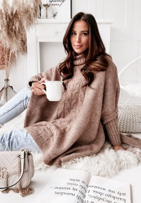 Sweter ponczo z golfem i wełną Tarina camelowy
