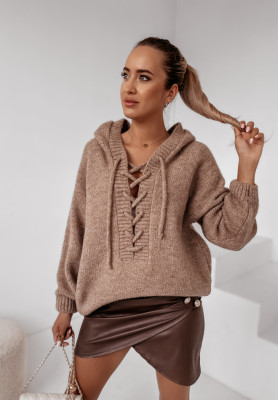 Sznurowany sweter oversize z kapturem i wełną Laossi camelowy