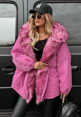 Krótka kurtka kożuszek z kwiecistą podszewką i wełną Lilianna fuksjowa