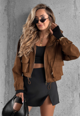 Krótka zamszowa kurtka z kapturem Bad Mood czekoladowa