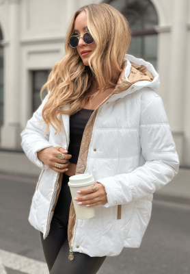 Krótka pikowana kurtka z kapturem w kwiaty Begonia biała