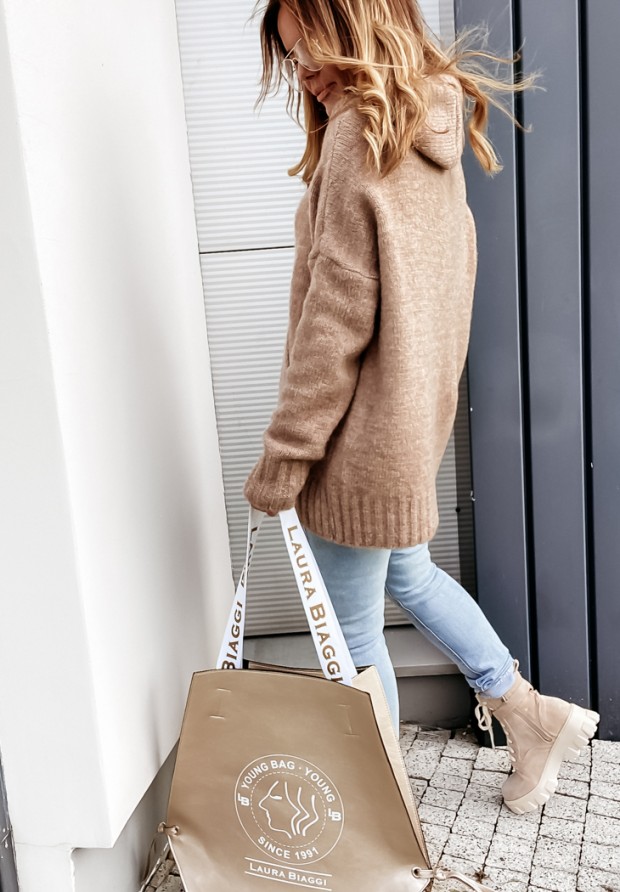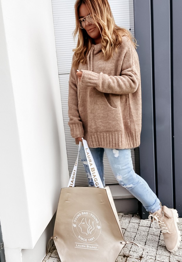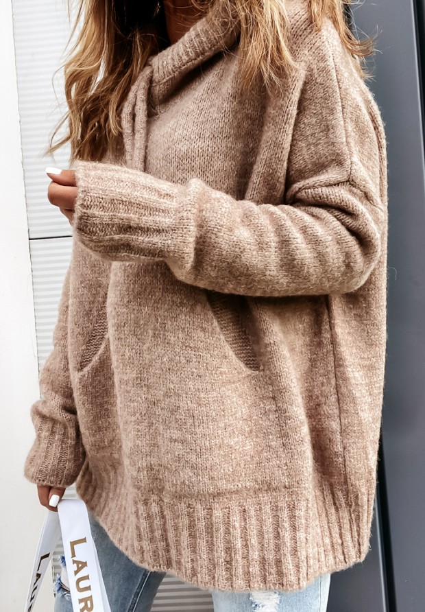 Sweter oversize z kapturem i wełną Carra camelowy