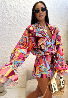 Lniany wzorzysty komplet koszula i spodenki La Milla Your Suggestion różowo-błękitny