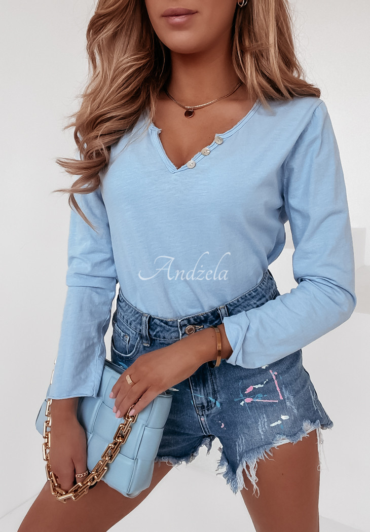 Basicowa bluzka z długim rękawkiem to świetna podstawa do codziennych stylizacji. Model jest surowo wykończony, posiada delikatny dekolt z niewielkim rozcięciem i ozdobnymi guzikami. Ta propozycja fantastycznie zaprezentuje się w zestawieniu z jeansami. Produkt wykonany został z wysokiej jakości materiału, dostępny jest w kilku wariantach kolorystycznych.