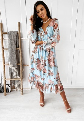Plisowana sukienka z kopertowym dekoltem w kwiaty Wisteria biało-niebieska