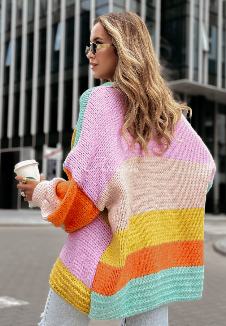 Sweter bardzo ładny, ale w rzeczywistości kolory nie są tak żywe jak na zdjęciu, raczej zgaszone i róż to bardziej jasny fiolet. Jeśli to komuś nie przeszkadza, to jest to bardzo ciekawy model. Fajne rękawy, choć mogłyby być nieco dłuższe. Choć spodziewałam się żywszych kolorów, takich jak na zdjęciu, sweter zostaje ze mną, gdyż i tak jest ciekawy, niecodzienny i w takich tonacjach zgaszonych równie ładny. Na jesień i zimę super się sprawdzi. Dobór i rozmieszczenie kolorów nietypowe, ale przez to przyciągające wzrok. Polecam. Jeszcze nie był prany, ale z innymi swetrami do tej pory, po wielu praniach wszystko jest ok.