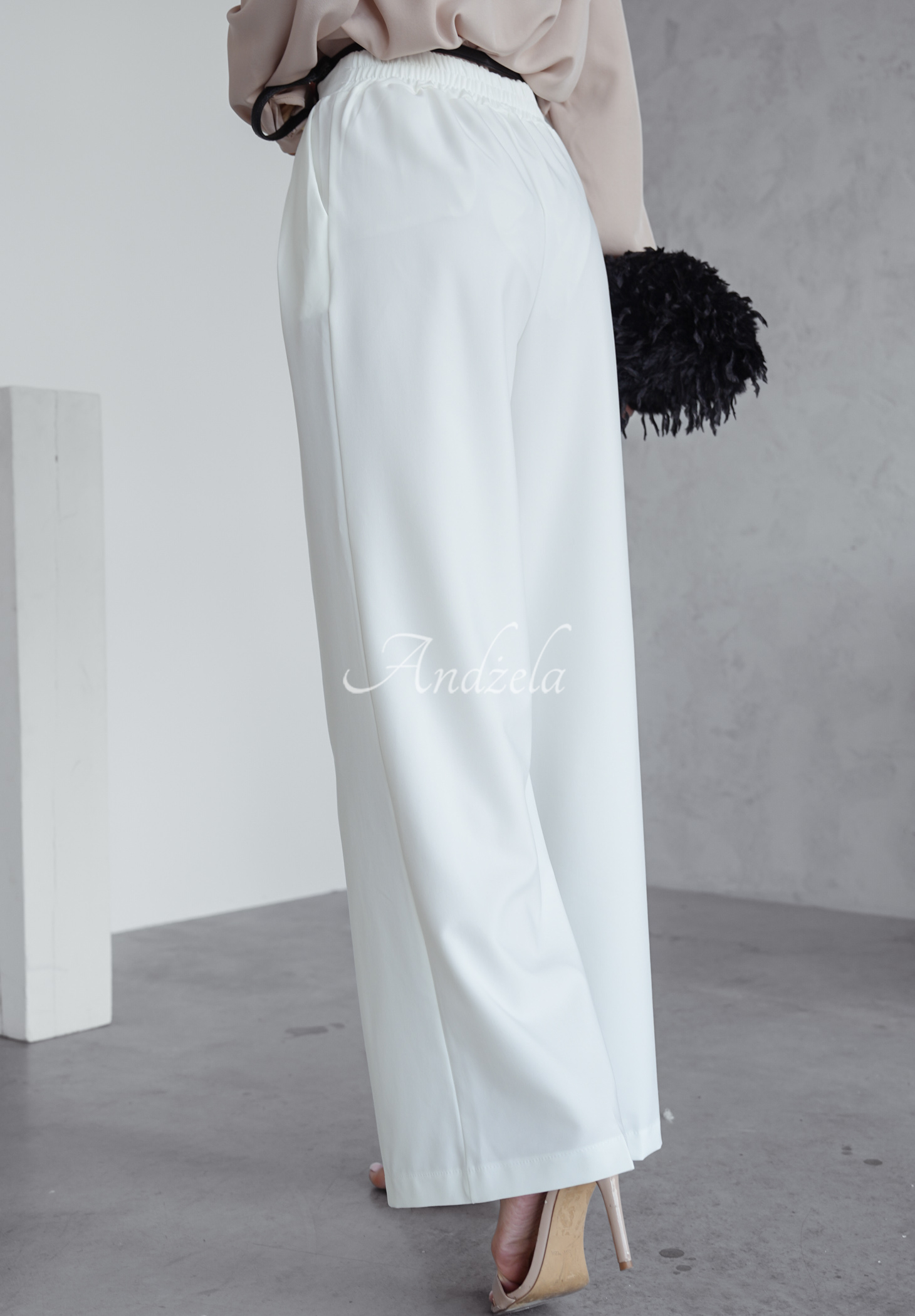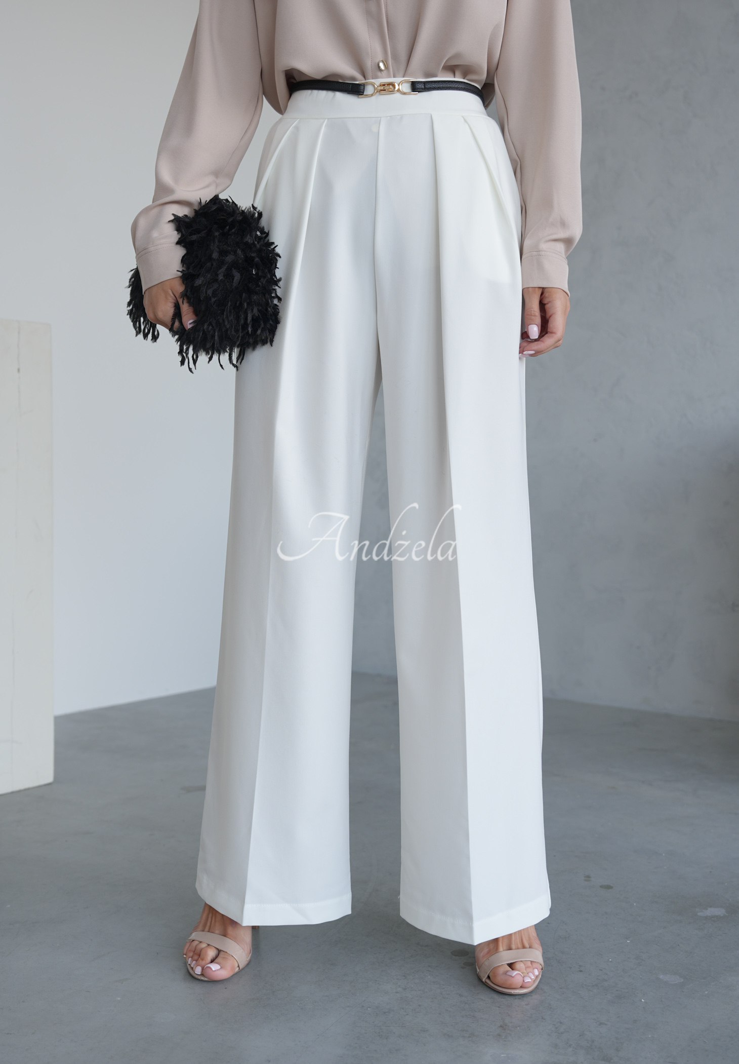 Materiałowe spodnie z wysokim stanem to propozycja, która doskonale sprawdzi się w codziennych, jak i eleganckich stylizacjach. Wykonane zostały z lekkiej tkaniny. To model z szerokimi nogawkami, posiada funkcjonalne kieszenie. Na przodzie znajdują się efektowne marszczenia, a w pasie elastyczna gumka, dzięki której całość idealnie dopasowuje się do sylwetki.