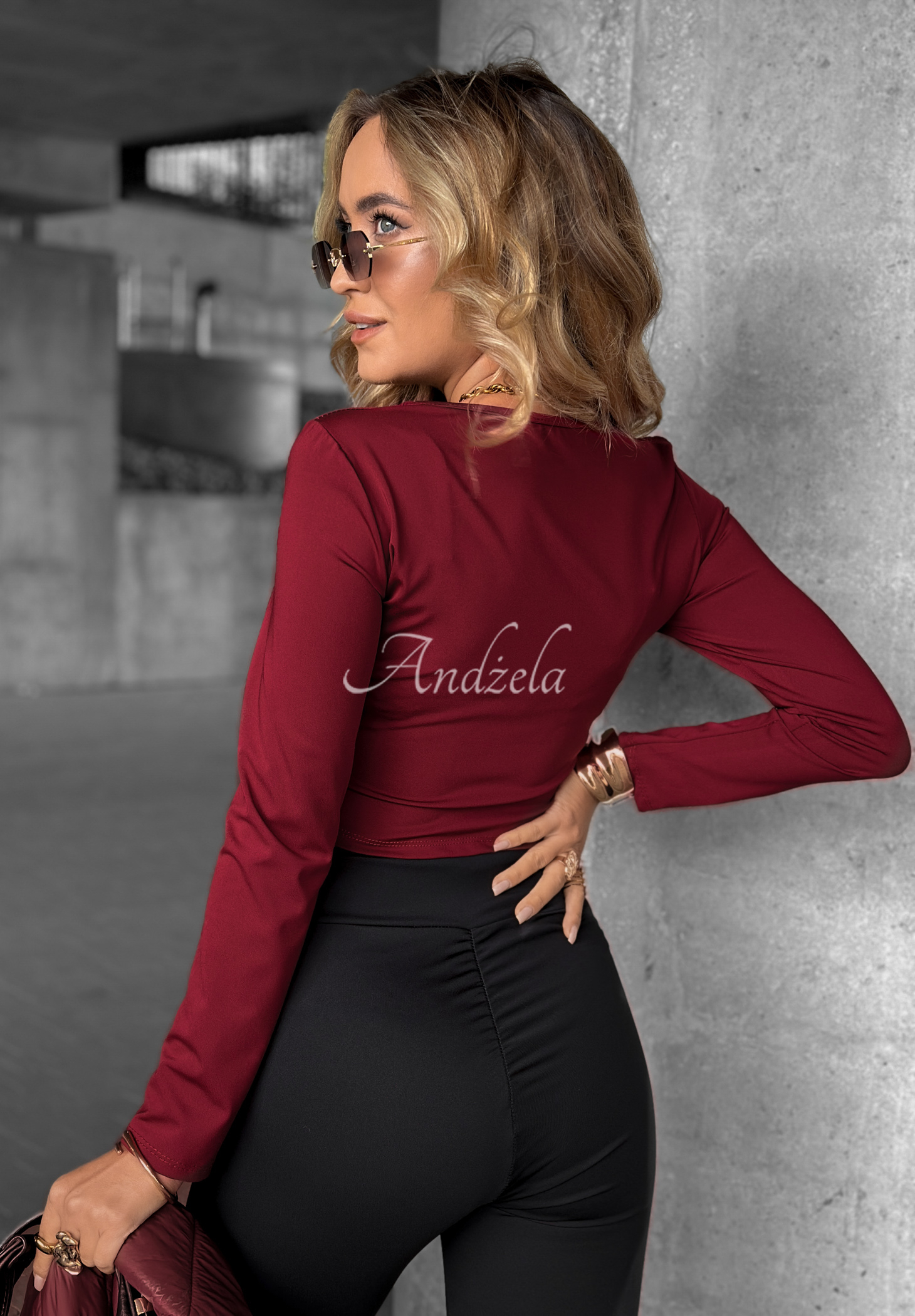 Krótka bluzka wykonana z przyjemnej w dotyku, elastycznej tkaniny. To model o dopasowanym fasonie z efektownym, kwadratowym dekoltem i długimi rękawami.* materiał elastyczny * kwadratowy dekolt * długie rękawy * krótki, dopasowany fason