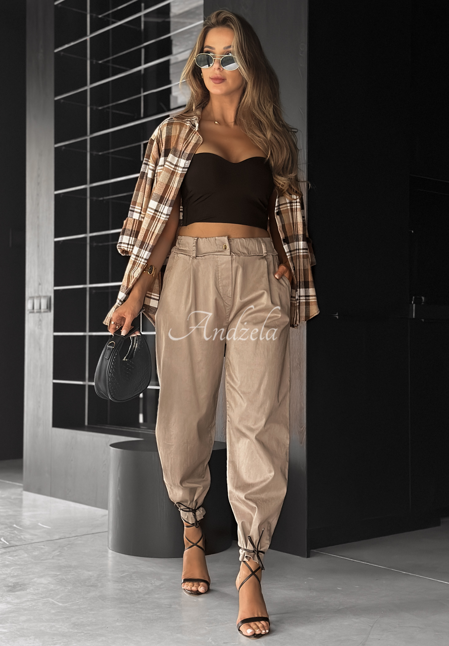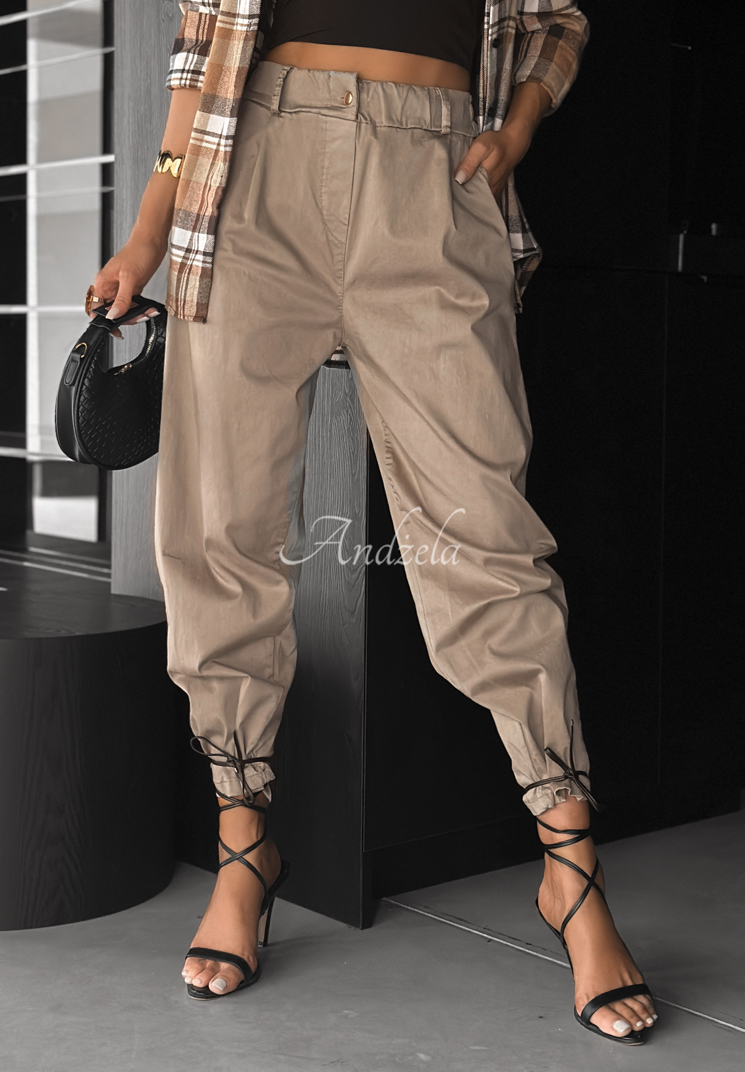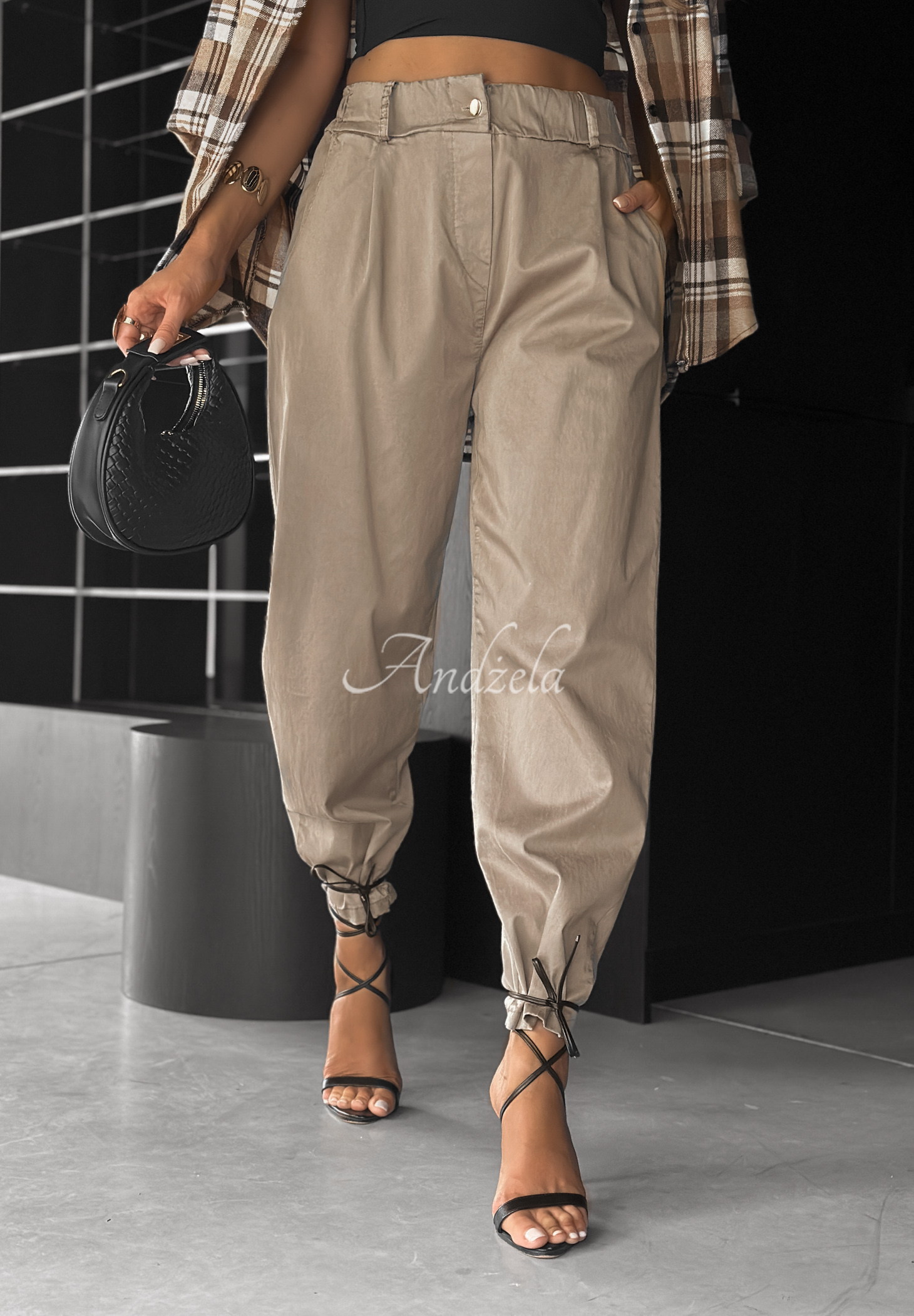 Spodnie wykonane z przyjemnego w dotyku, elastycznego materiału. To model z podwyższonym stanem, zapinany na pojedynczy, złoty guzik. Posiada