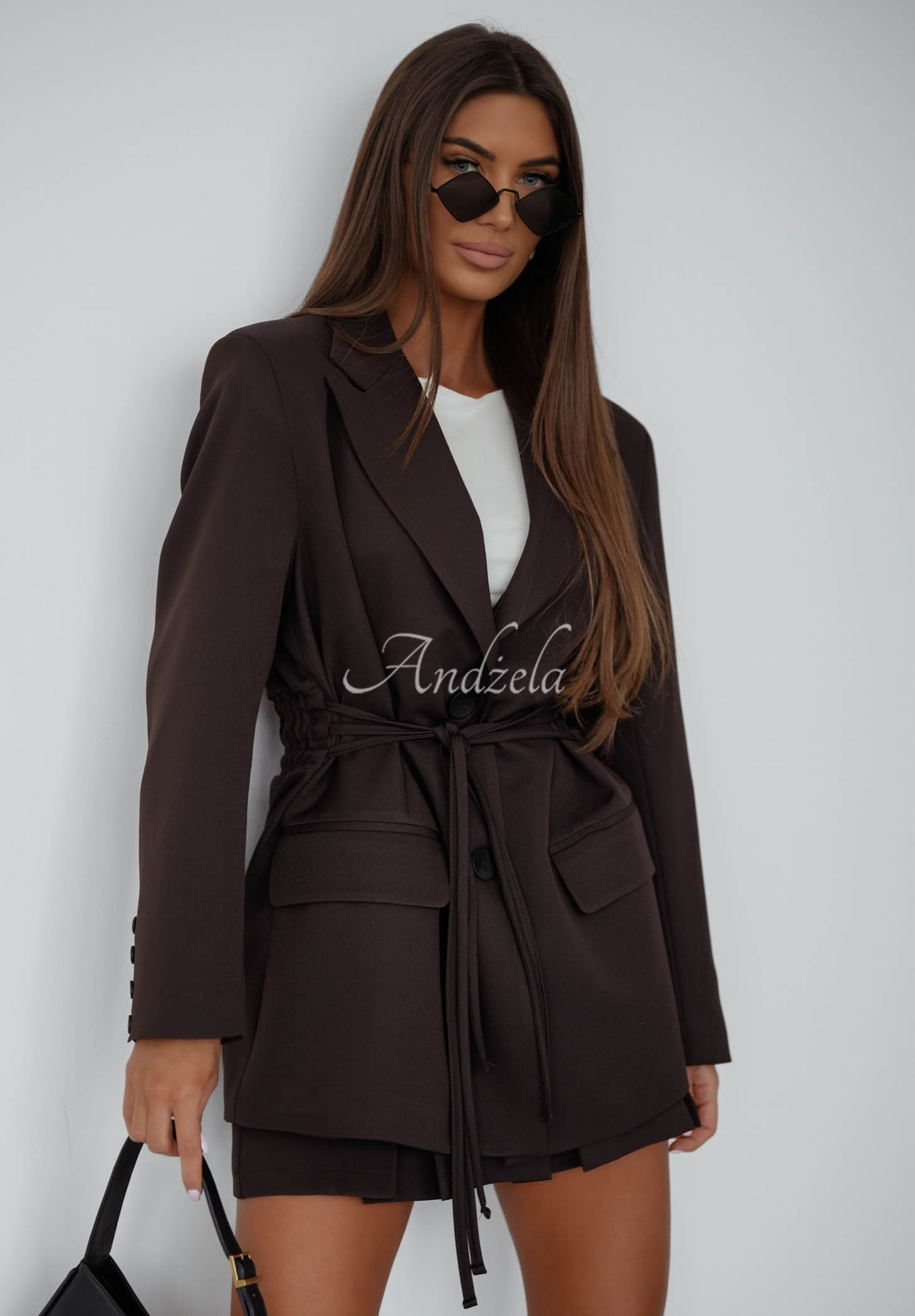 Marynarka o oversizowym kroju z kołnierzem, wykonana z materiału z domieszką wiskozy. Model wyróżniają nadające kształtu poduszki na ramionach. Posiada zapięcie na guziki, oraz wszyte wiązanie w talii.