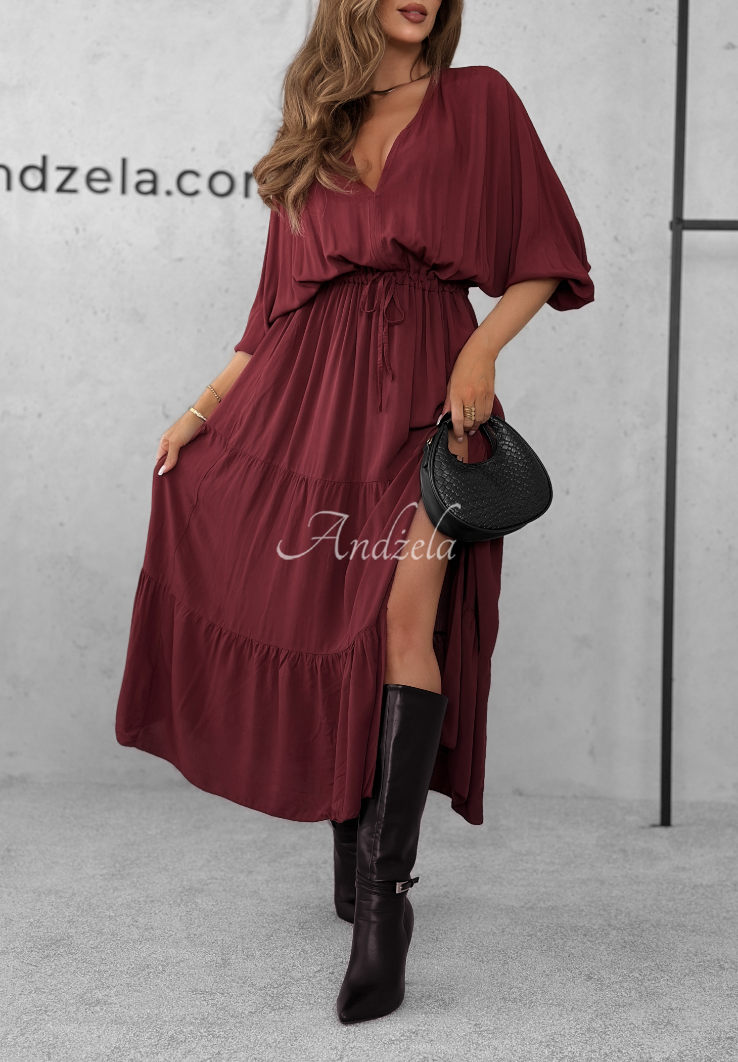 Wiskozowa sukienka o długości maxi z górą o kroju nietoperz. Wyróżnia się niezwykle kobiecym, głęboko wyciętym dekoltem, a także rozcięciem na boku. To oversizowy model z regulowanym ściągaczem w talii, długimi rękawami oraz kieszeniami. Zwiewne falbany nadają całości lekkości.