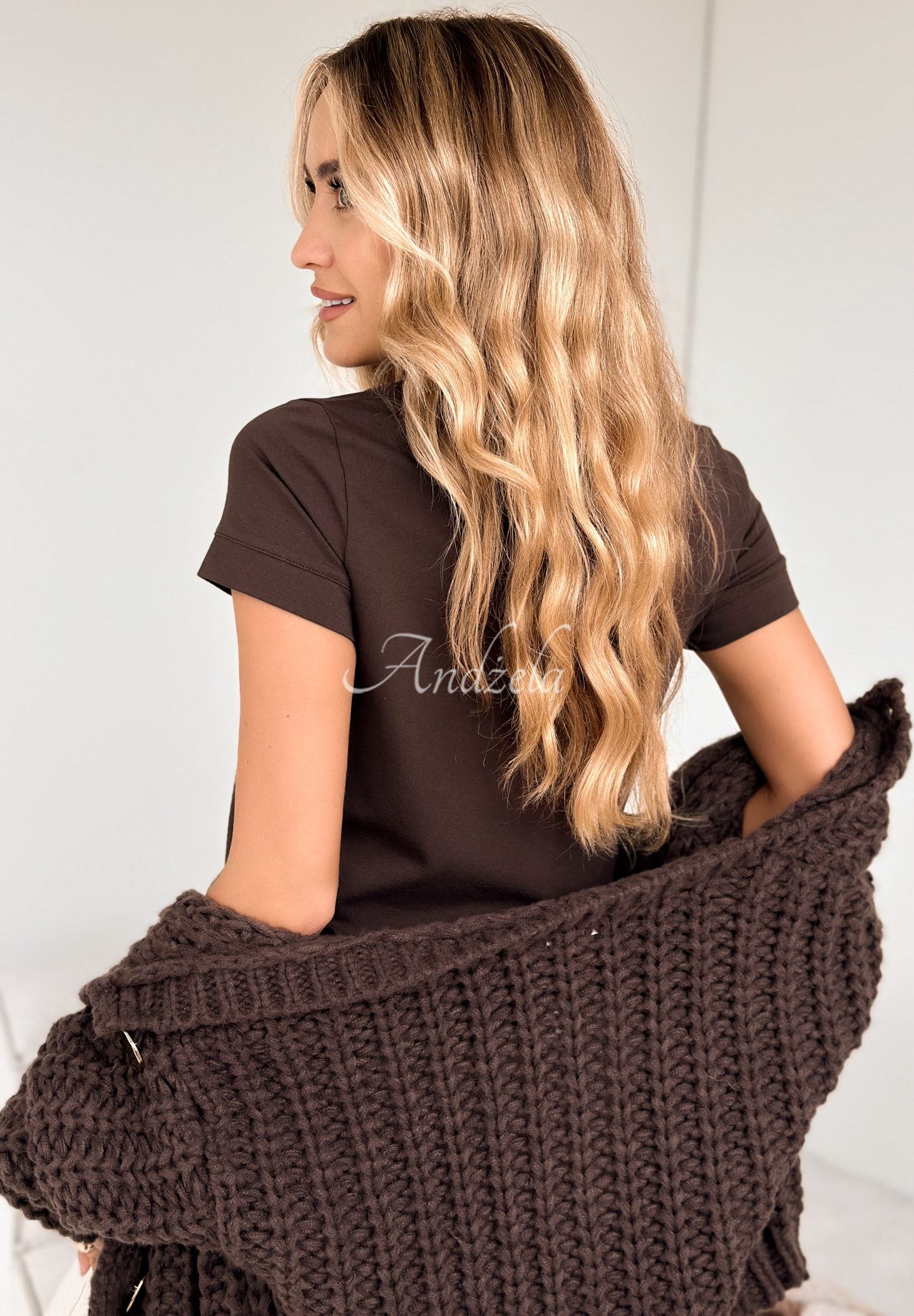 Bawełniany T-shirt z dekoltem w serek Lauren czekoladowy