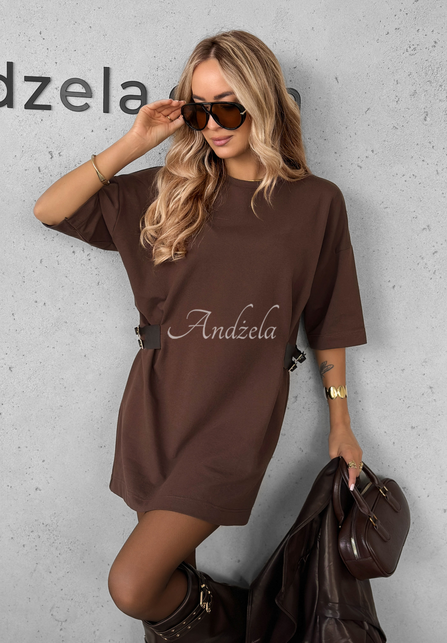Sukienka wykonana z elastycznego, bawełnianego materiału. Wyróżnia się regulowanymi paseczkami w talii. To model o długości mini z zaokrąglonym dekoltem i krótkimi rękawami.