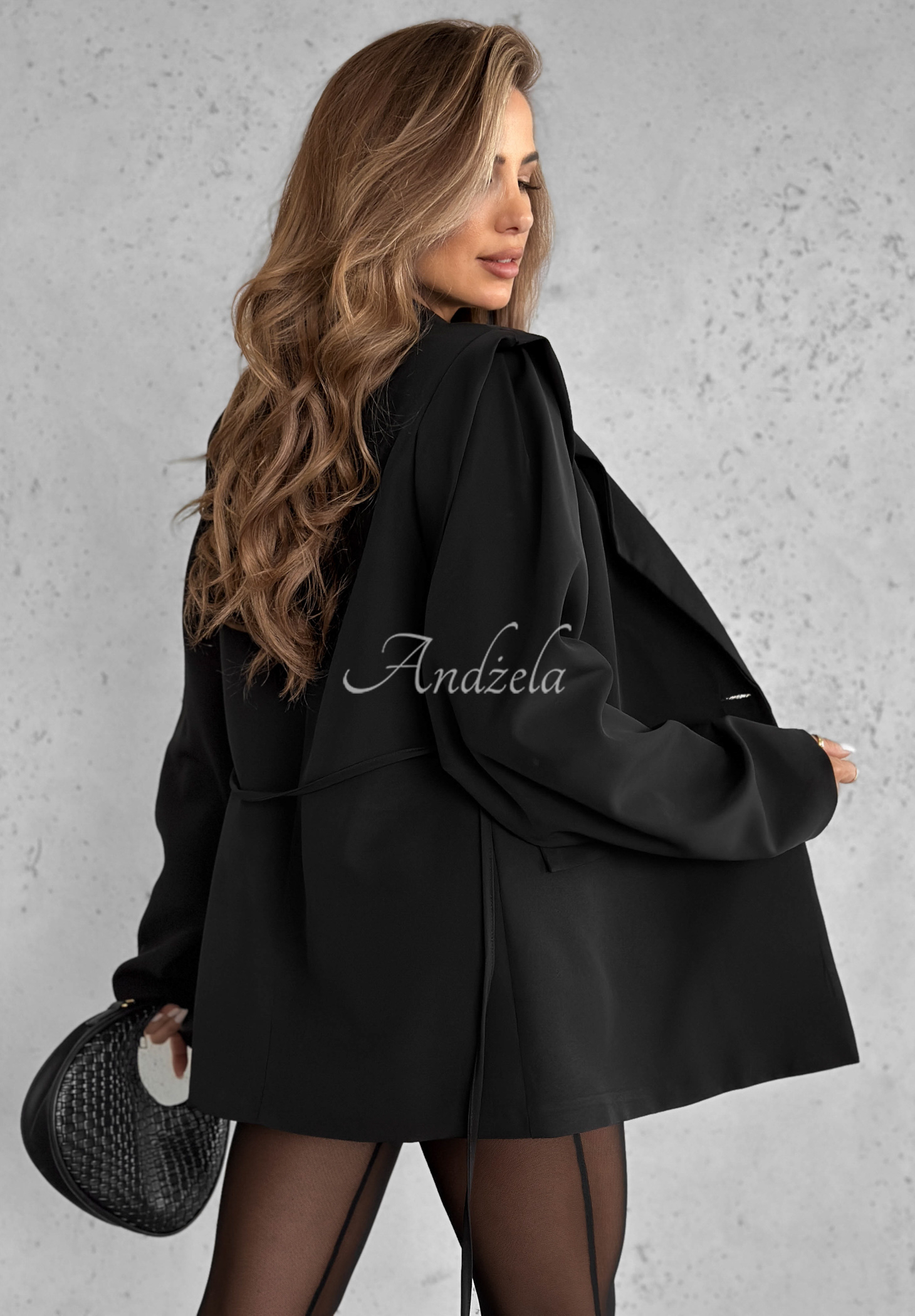 Marynarka z kołnierzem i wiązaniem w pasie. To propozycja, której atutem są nadające kształtu poduszki na ramionach i szerokie rękawy. Zapinana na pojedynczy guzik, posiada imitacje kieszeni. Pod spodem znajduje się podszewka.