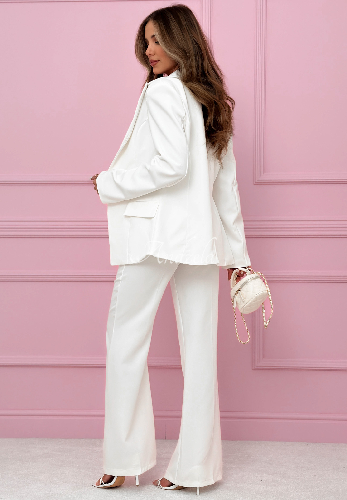 Elegancki, taliowany garnitur z rozszerzanymi nogawkami. Marynarka z kołnierzykiem, posiada nadające kształtu poduszki na ramionach oraz zapięcie na pojedynczy guzik. Spodnie to model z podwyższonym stanem i funkcjonalnymi kieszeniami.