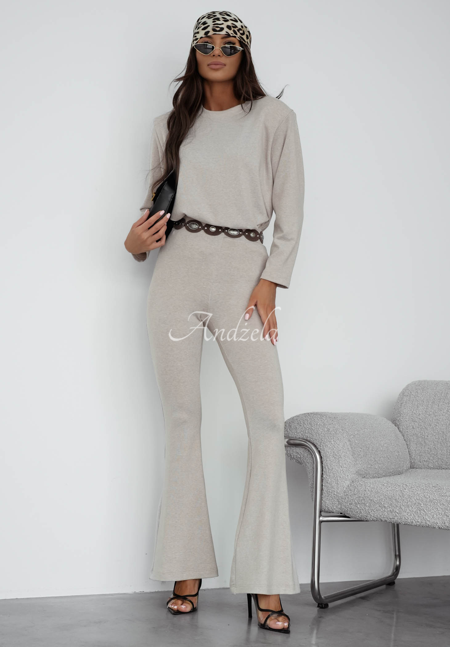 Dopasowane spodnie dzwony z rozszerzaną nogawką w dolnej części. To model z gumką w pasie i podwyższonym stanem, wykonany z elastycznej bawełny. Doskonale zaprezentuje się w zestawieniu z bluzką z linii ''Nicole''.