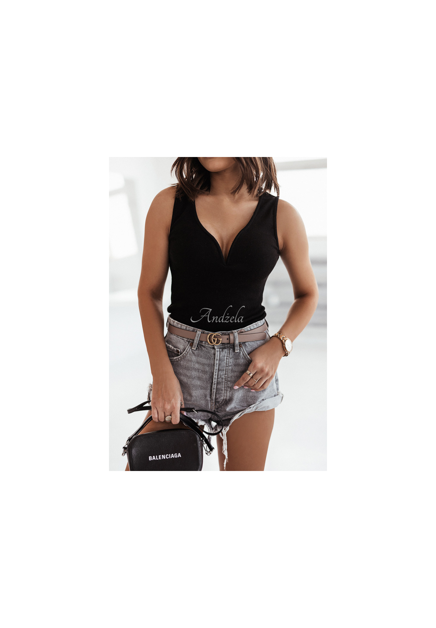 Prążkowana bluzka na szerokich ramiączkach, wyróżniająca się głęboko wyciętym, usztywnianym dekoltem. Niezwykle kobiecy model, który świetnie sprawdzi się w codziennych stylizacjach. Produkt wykonany został z wysokiej jakości materiału, dostępny jest w kilku wariantach kolorystycznych.