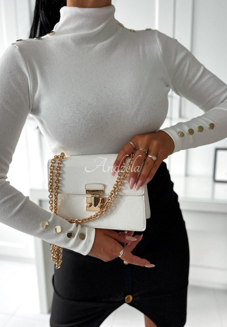 Bluzka z golfem to basic, który powinien znaleźć się w każdej garderobie. Wykonana została z przyjemnego w dotyku materiału, a dzięki elastyczności doskonale dopasowuje się do sylwetki. Na rękawach znajdują się ozdobne guziki, nadające całości charakteru. Produkt dostępny jest w dwóch wariantach kolorystycznych.