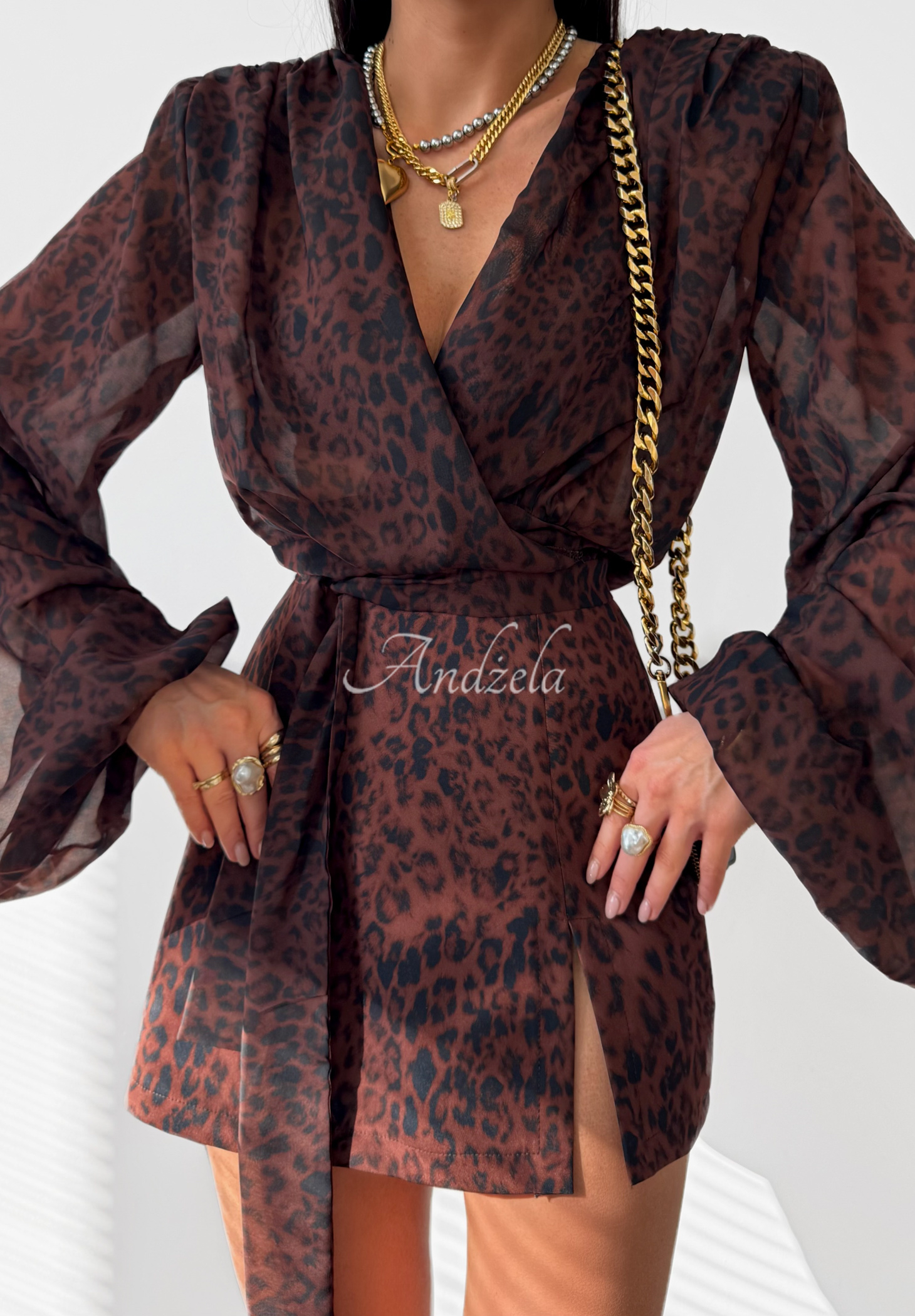 Wiskozowa bluzka wyróżniająca się modnym wzorem w panterkę. Wykonana z lekkiej, transparentnej tkaniny. To fason z efektownym wiązaniem znajdującym się w dolnej części oraz nadającymi kształtu poduszkami na ramionach. Długie rękawy zakończone zostały gumką.