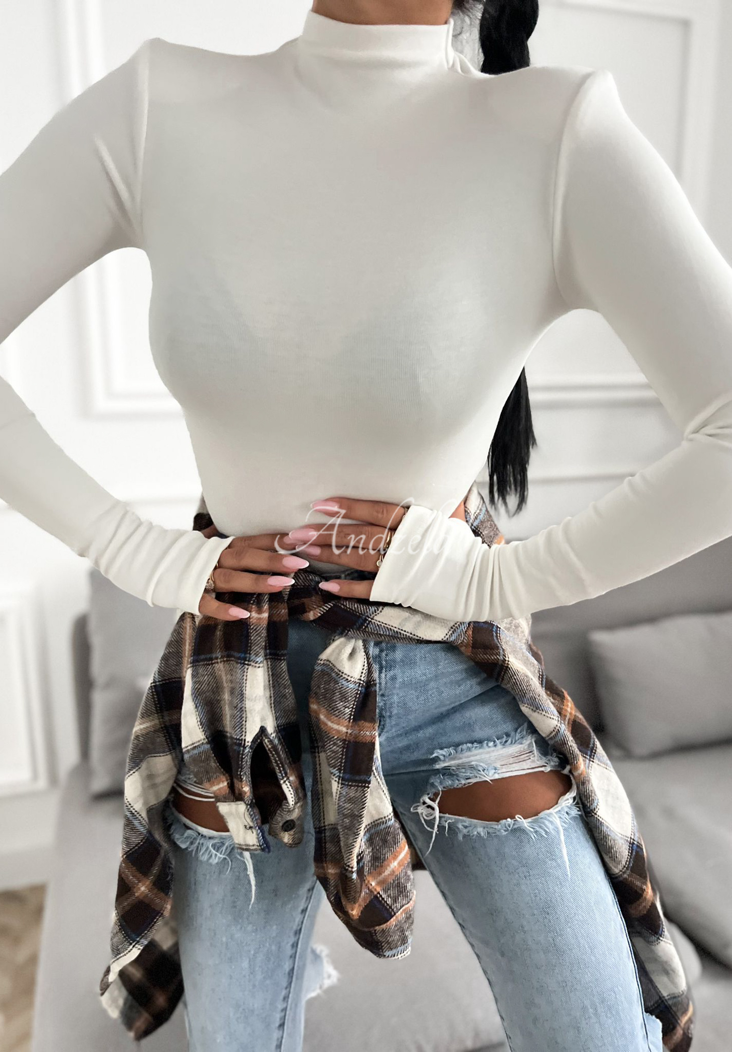 Bluzka wykonana z wysokiej jakości wiskozowego materiału to basic, który powinien znaleźć się w każdej garderobie. To model z półgolfem oraz nadającymi kształt poduszkami na ramionach. Jest elastyczna, dzięki czemu idealnie dopasuje się do sylwetki, dodatkowo posiada wycięcia na kciuki przy zakończeniach rękawów.