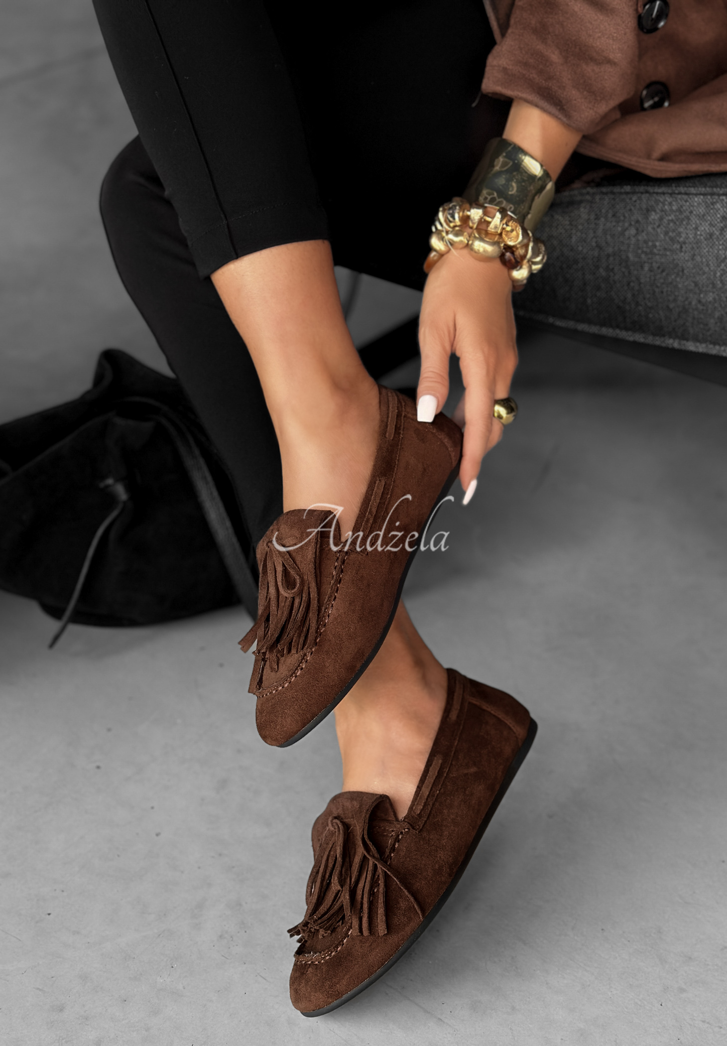 Mokasyny wykonane z zamszowego materiału, osadzone na płaskiej podeszwie. To model z zaokrąglonym noskiem, wyróżnia się ozdobnymi frędzlami znajdującymi się z przodu.* imitacja zamszu * frędzle * zaokrąglony nosek* płaska podeszwa