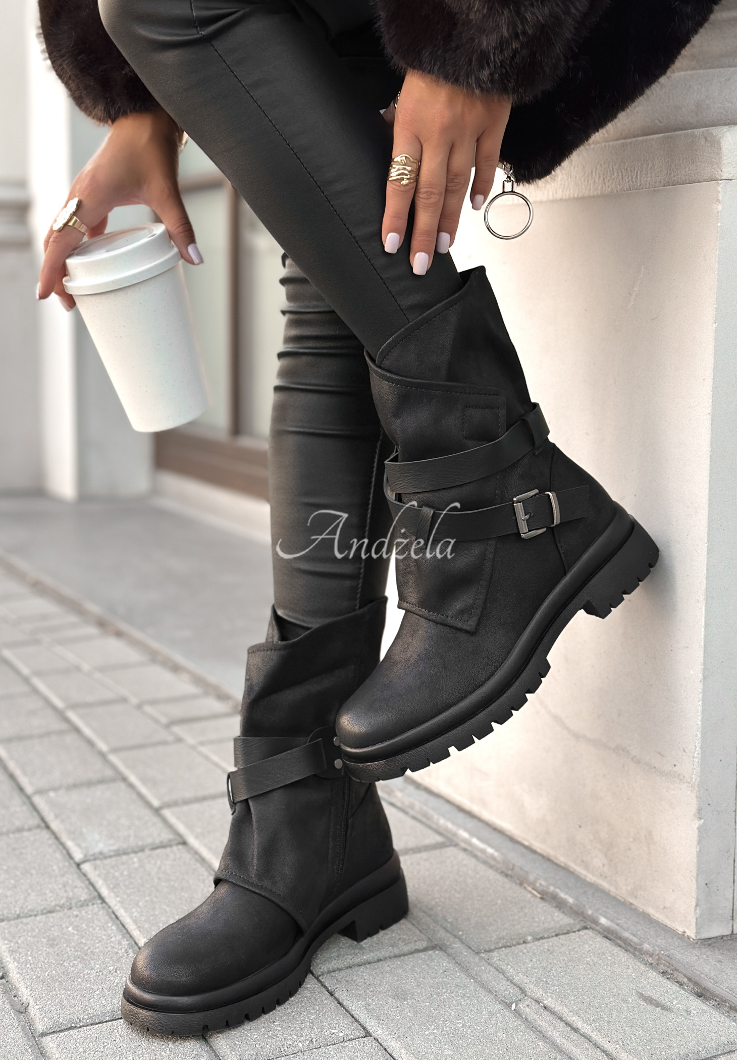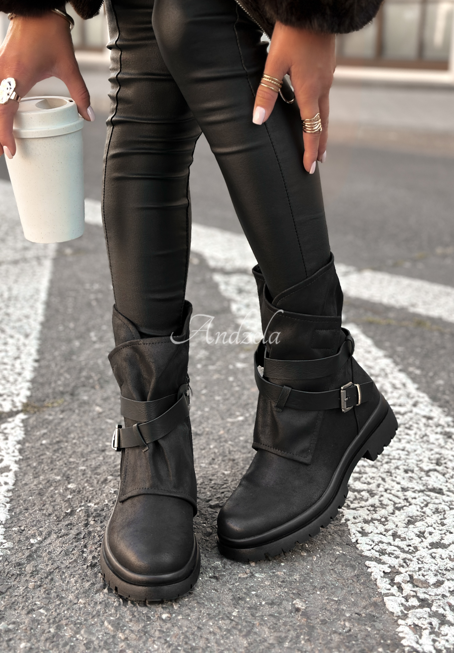 Botki wyróżniające się dodatkowym materiałem oraz paskami z klamerkami. To model z cholewką za kostkę, osadzony na podwyższonej podeszwie. Został wykonany z matowego, skórzanego materiału. Posiada zaokrąglony nosek oraz zapięcie na suwak, znajdujący się z boku.