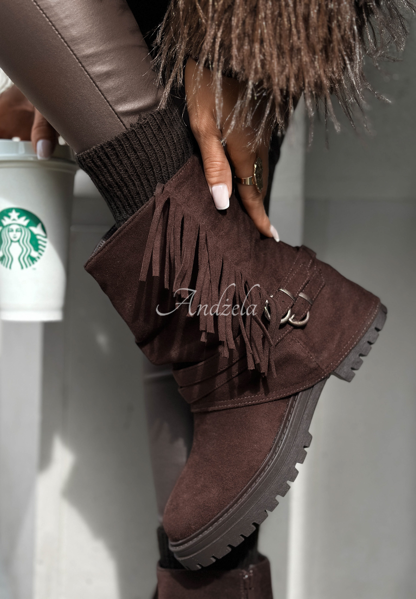 Botki z imitacji zamszu to model wyróżniający się dodatkowym materiałem z frędzlami i klamerkami. To model z cholewką za kostkę oraz zaokrąglonym noskiem. Zapinany na suwak znajdujący się od wewnętrznej strony.