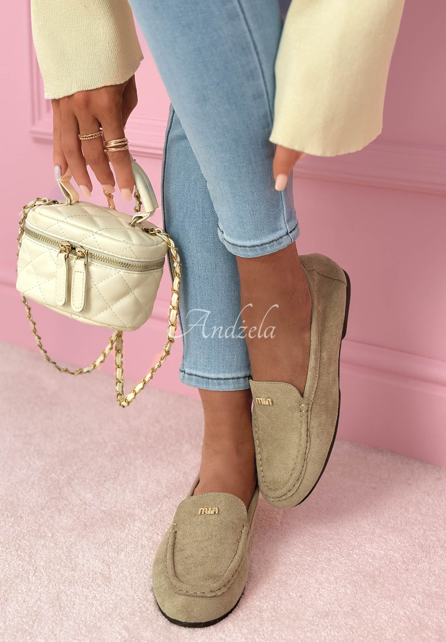 Zamszowe mokasyny osadzone na płaskiej, gumowej podeszwie. To propozycja z zaokrąglonym noskiem, wyróżniająca się złotym elementem znajdującym się z przodu. Posiada wkładkę wykonaną ze skóry naturalnej.