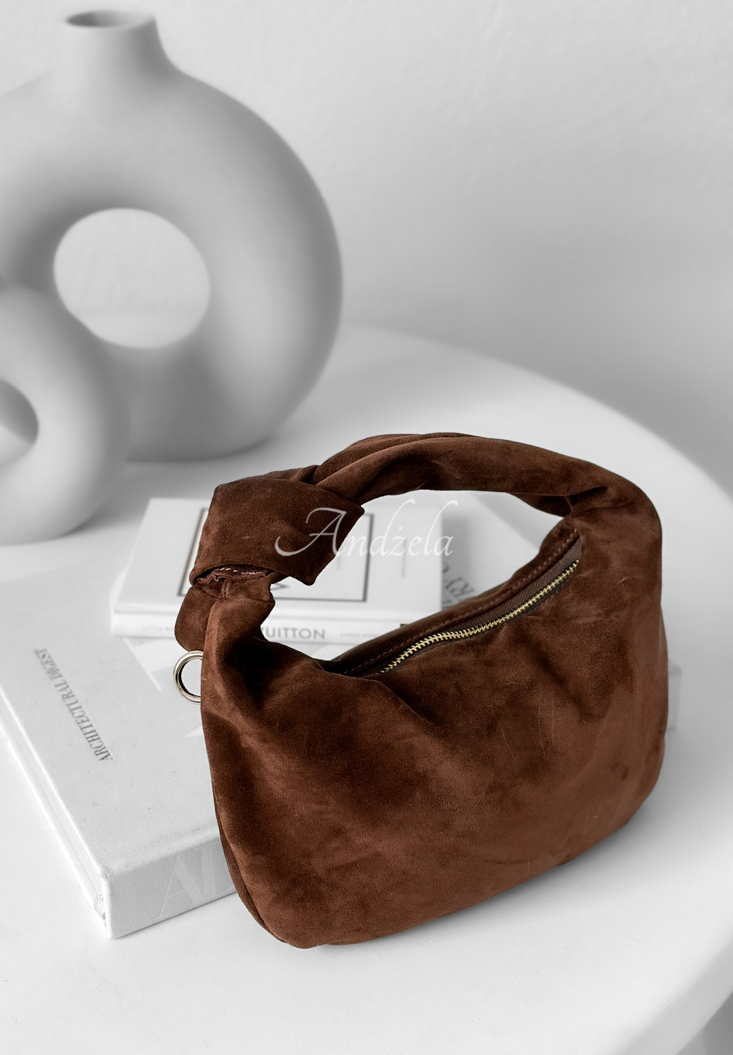 Zamszowa torebka wykonana z wysokiej jakości skóry naturalnej. To jednokomorowy model z zapięciem na suwak. Posiada rączkę, regulowany pasek oraz pojedynczą kieszonkę wewnątrz. Całość dopełniają złote detale.