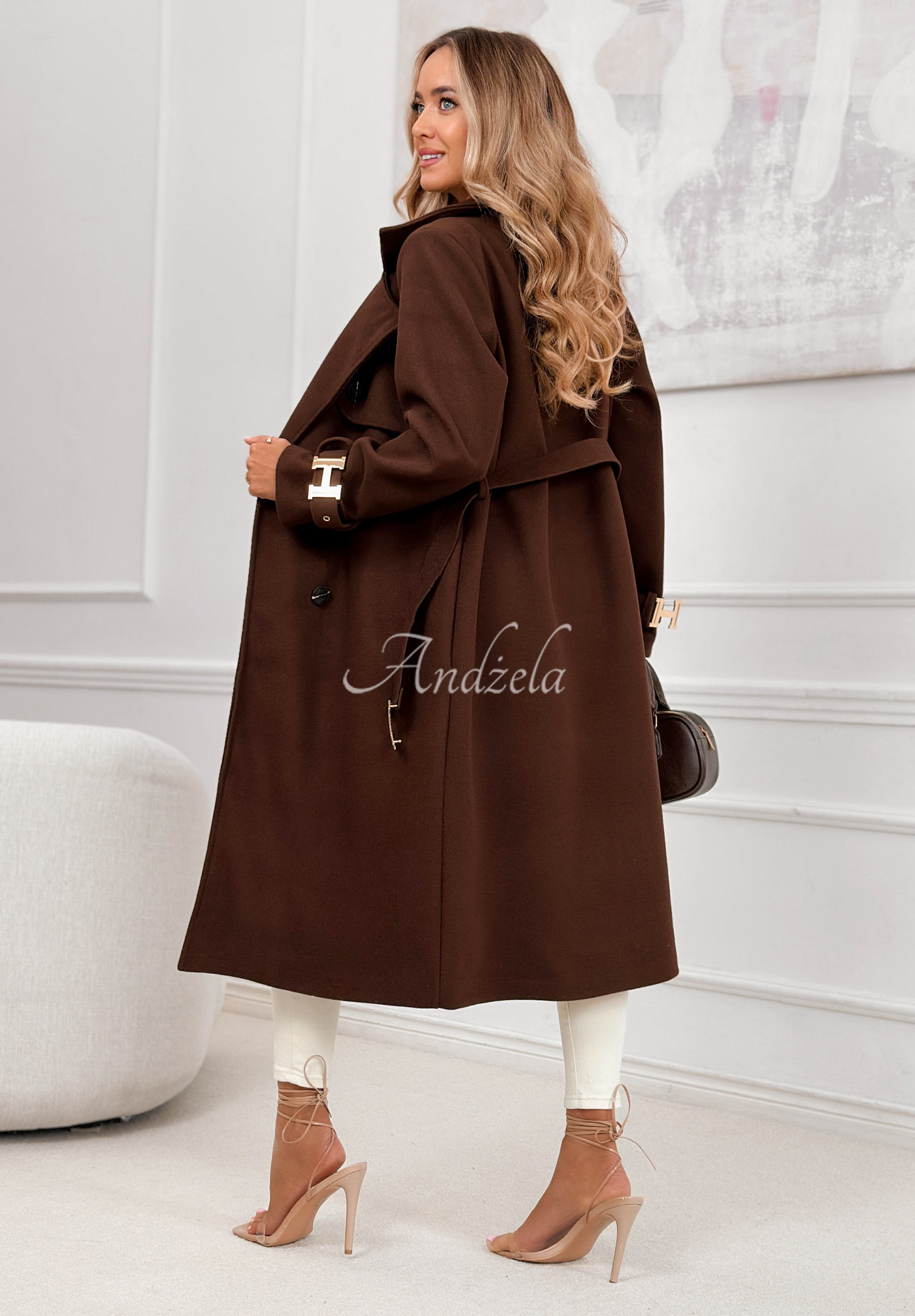 A double-breasted coat with a longer cut. This model has a collar and button fastening. There are shoulder pads on the shoulders to give shape. It has functional pockets and long sleeves with gold buckles. The set includes a fabric belt.