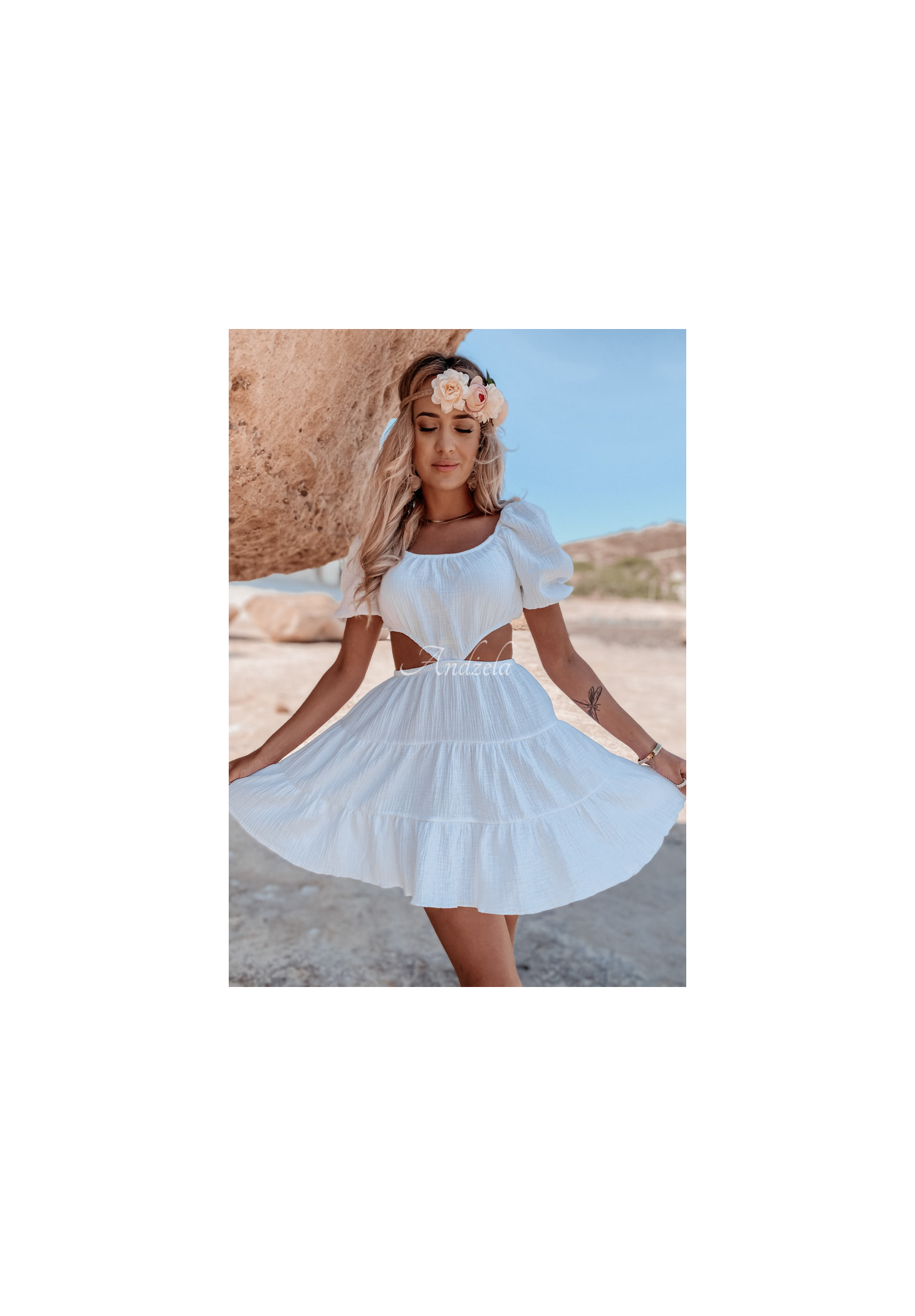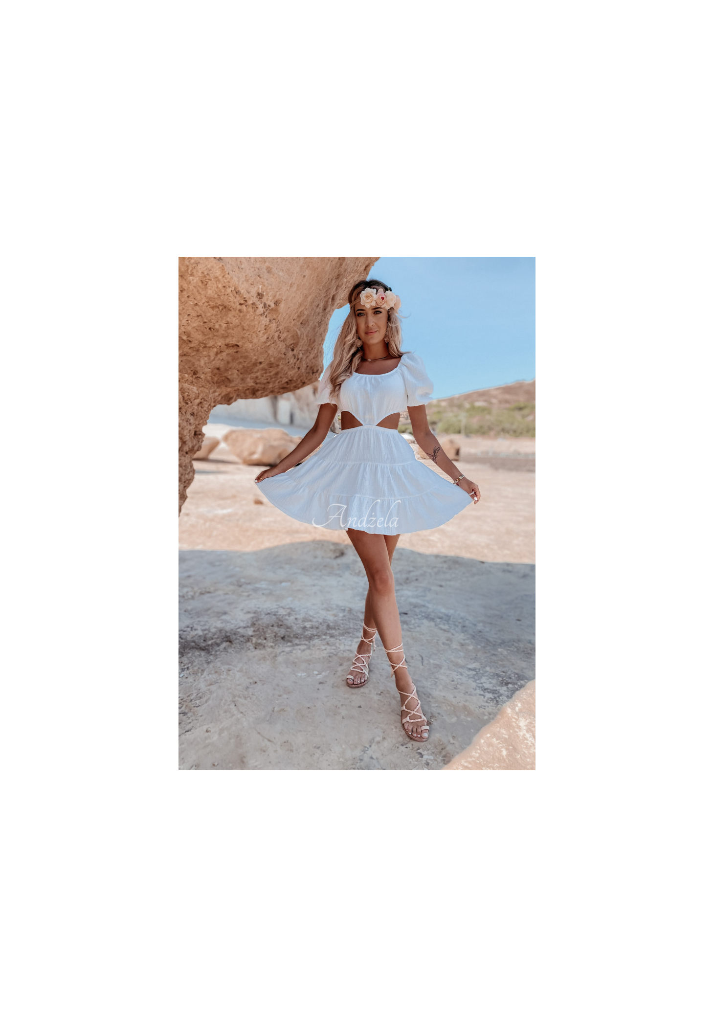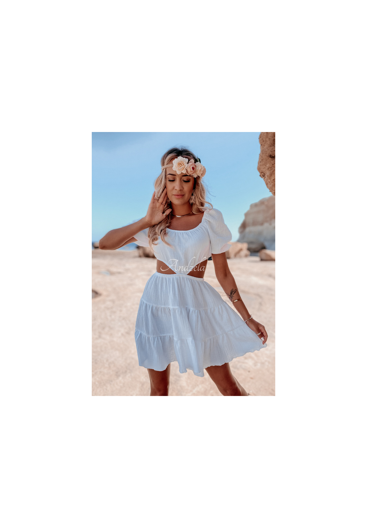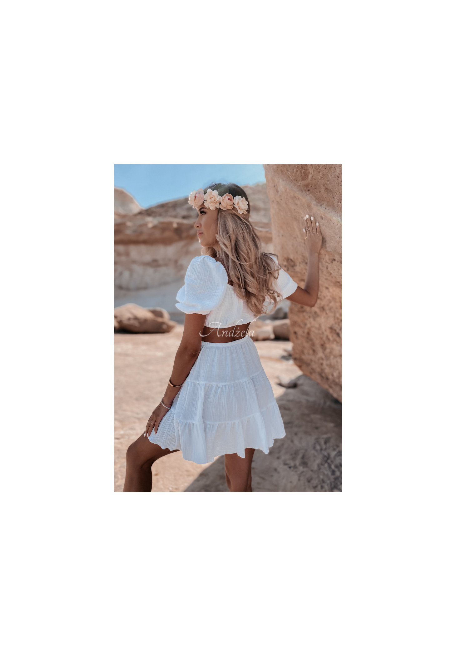 A lightweight muslin dress is an ideal choice for the summer season. The model consists of a skirt and a short top, joined together at the front. The sleeves are finished with ribbed cuffs, at the bottom there is a girly frill. This proposal is a great base for everyday styling on hot days. The product is made of high quality material, it is available in several color variants.