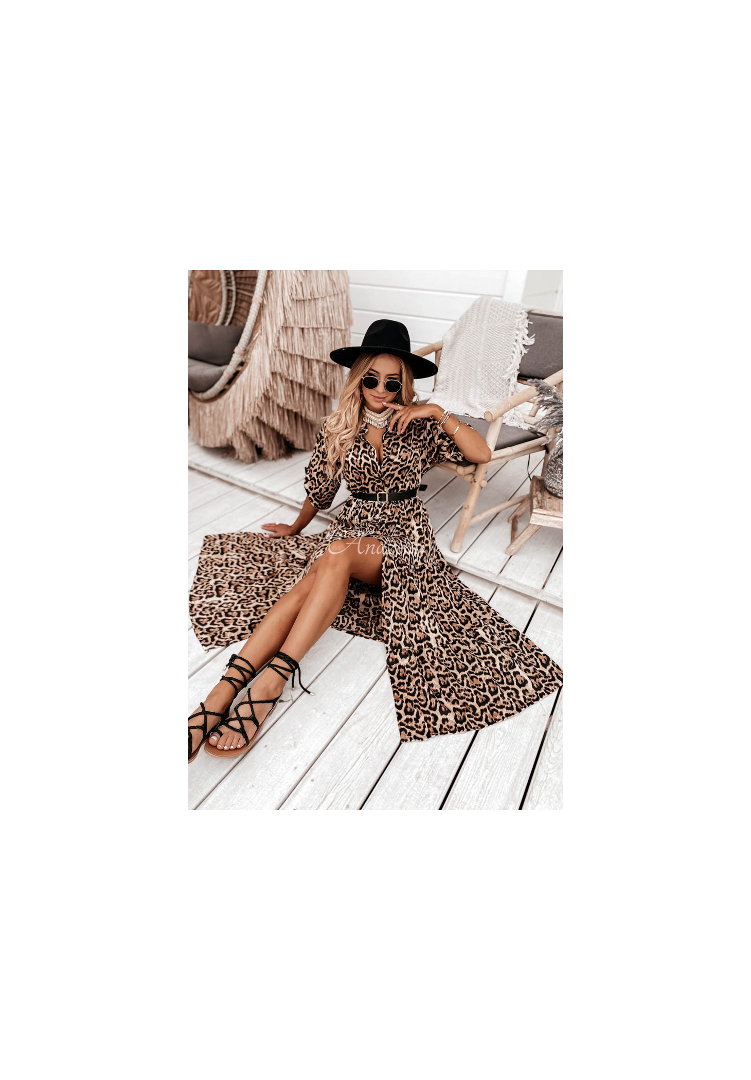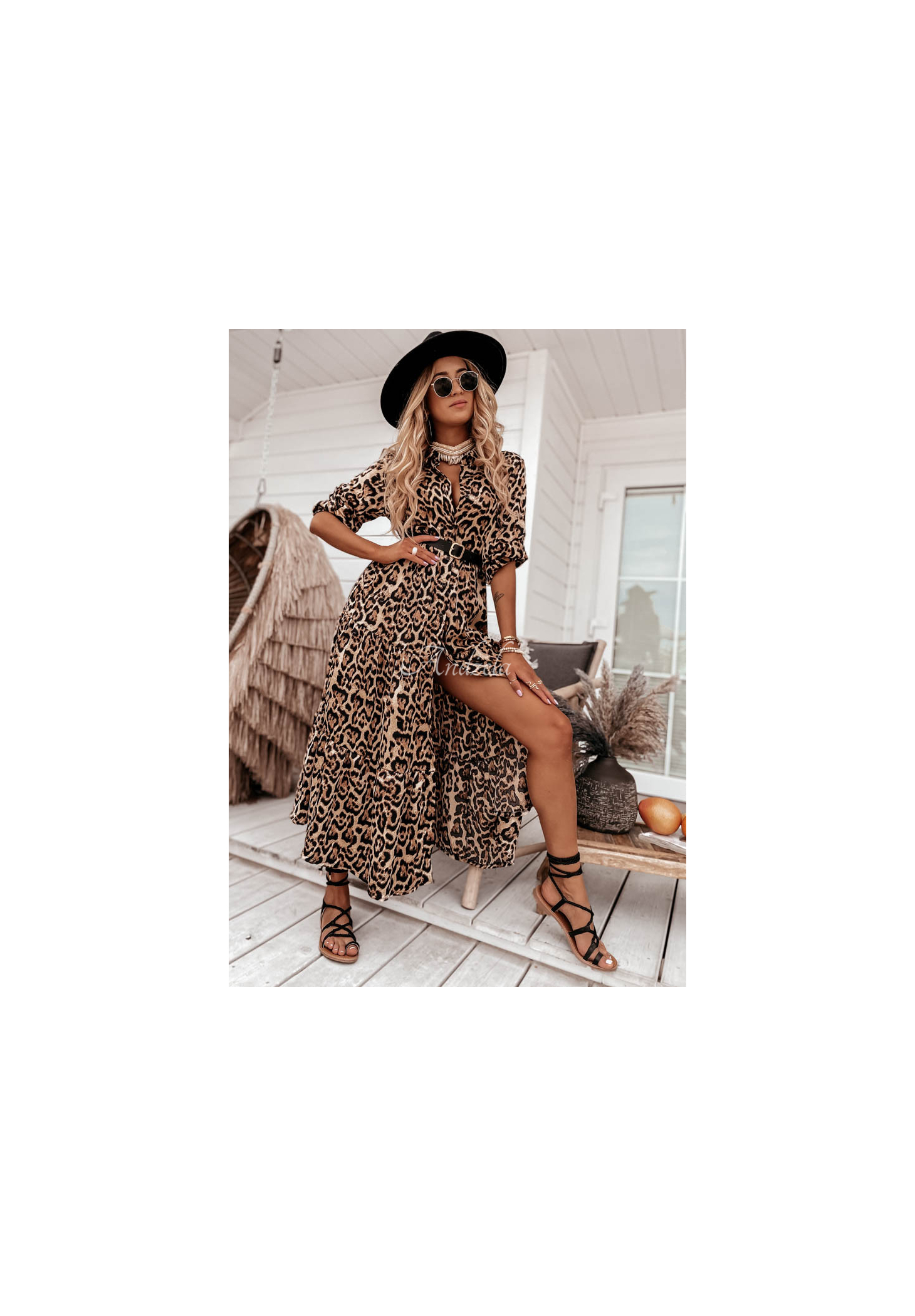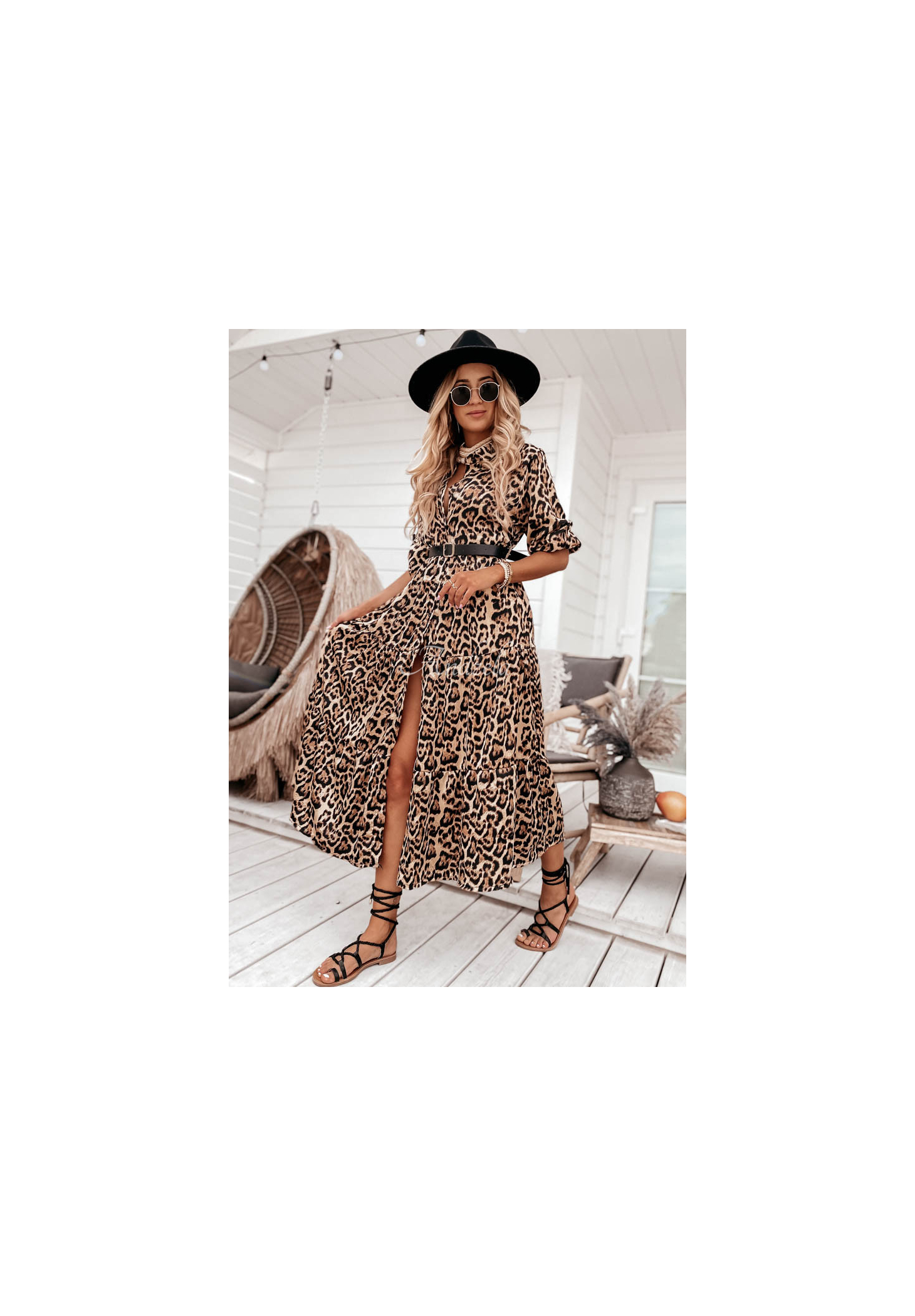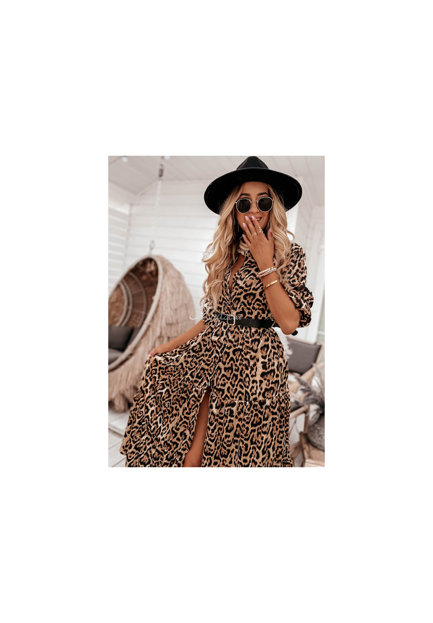 The dress in a fashionable leopard-print pattern is a proposal ideal for various occasions. It was made of smooth material, similar to satin. It comes with a belt, which will be great for accentuating the silhouette. The model is buttoned and has long adjustable sleeves. The bottom is finished with a ruffle, giving the whole thing an airy look. This is an option that will look phenomenal when paired with sandals in holiday loos.