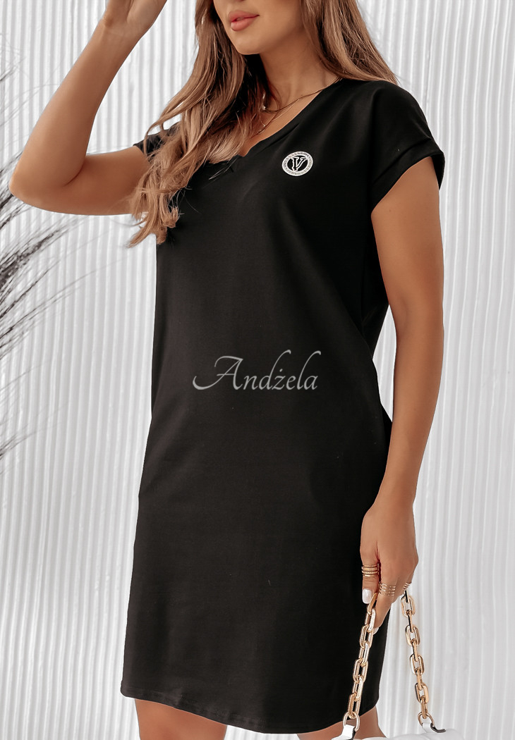 Trapezoidal cut dress with a decorative patch at bust level. The model has a heart neckline, as well as short sleeves. There are functional pockets on the front. This proposition is a perfect choice for girly looks in a sporty style.
