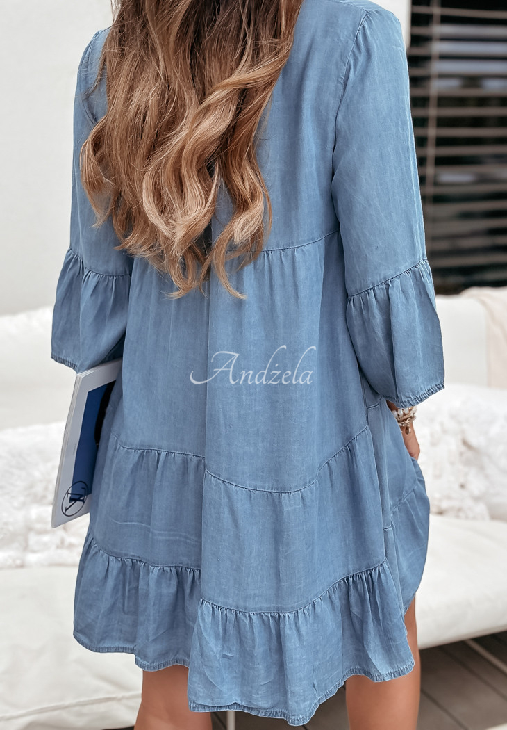 Dress made of lightweight fabric, resembling denim. It is a model with a widened cut with girly ruffles, as well as 3/4 length sleeves, and there is a button closure at the front. This proposal is a perfect choice for everyday wear in the summer season.