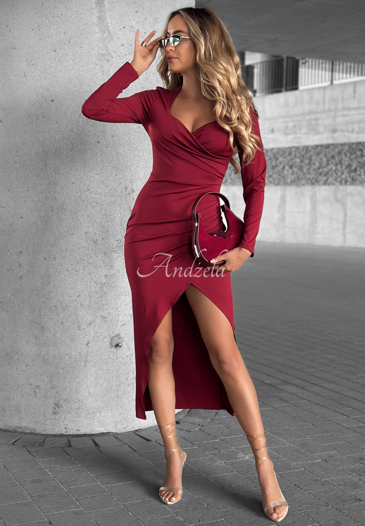 Dress made of smooth, stretchy material. It features a deep neckline and long sleeves. The model is distinguished by a striking slit on the side and sewn-in cups.