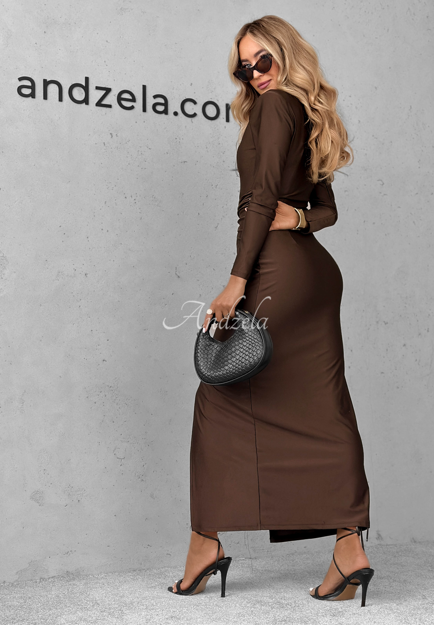 Exceptional dress in a fitted cut with a decorative crease at the front. It is distinguished by a collar and a slit in the lower part. Its additional advantage is the shaping shoulder pads.
