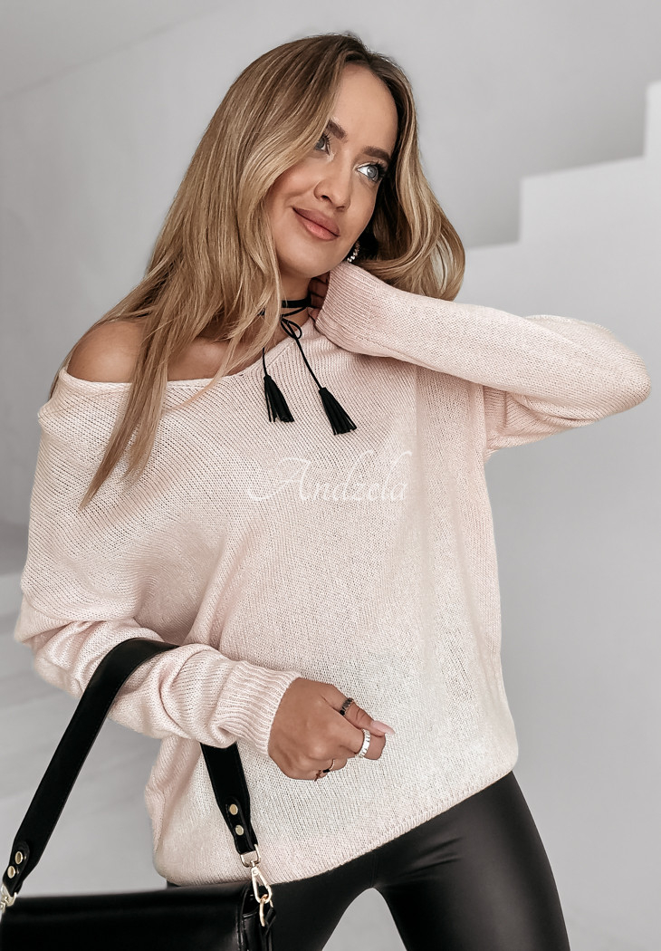 A lightweight sweater with a v-neck is an excellent choice for many everyday outfits. The model has a slight ribbing at the ends of the sleeves and at the bottom. Available in many color versions. Design by ANDŻELA!
