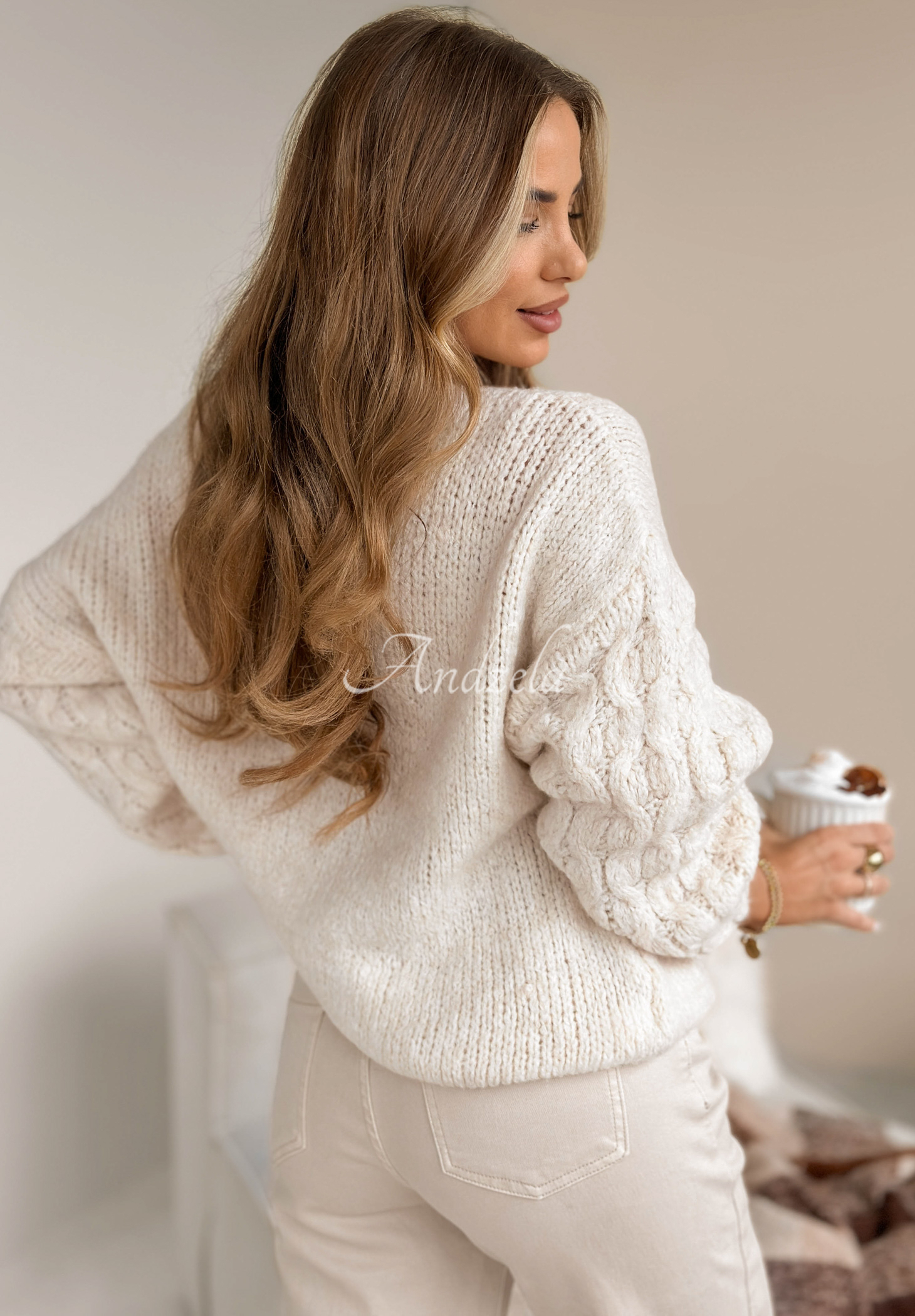 Sweater with a slightly oversized cut, made of stretch fabric with a blend of wool and viscose. It is a model with a rounded neckline, distinguished by braided sleeves. Both at their end and at the bottom there are welts.