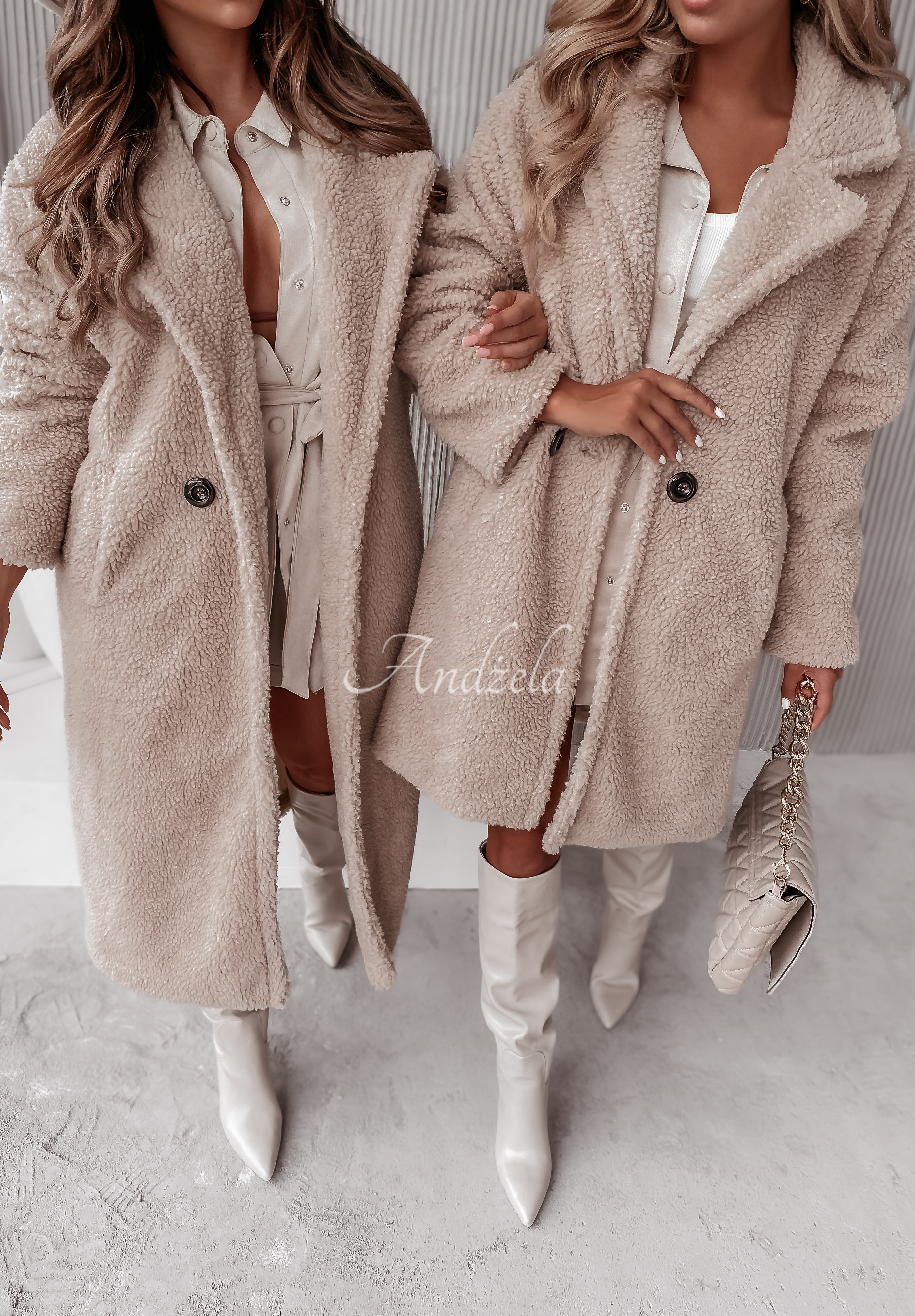 The imitation sheepskin coat with a blend of wool is a perfect complement to autumn looks. The model has an oversized cut and is buttoned. It has a collar, as well as pockets located in the front. It will phenomenally present itself in everyday and even elegant looks. The product is made of high-quality material, and is available in two color variants.