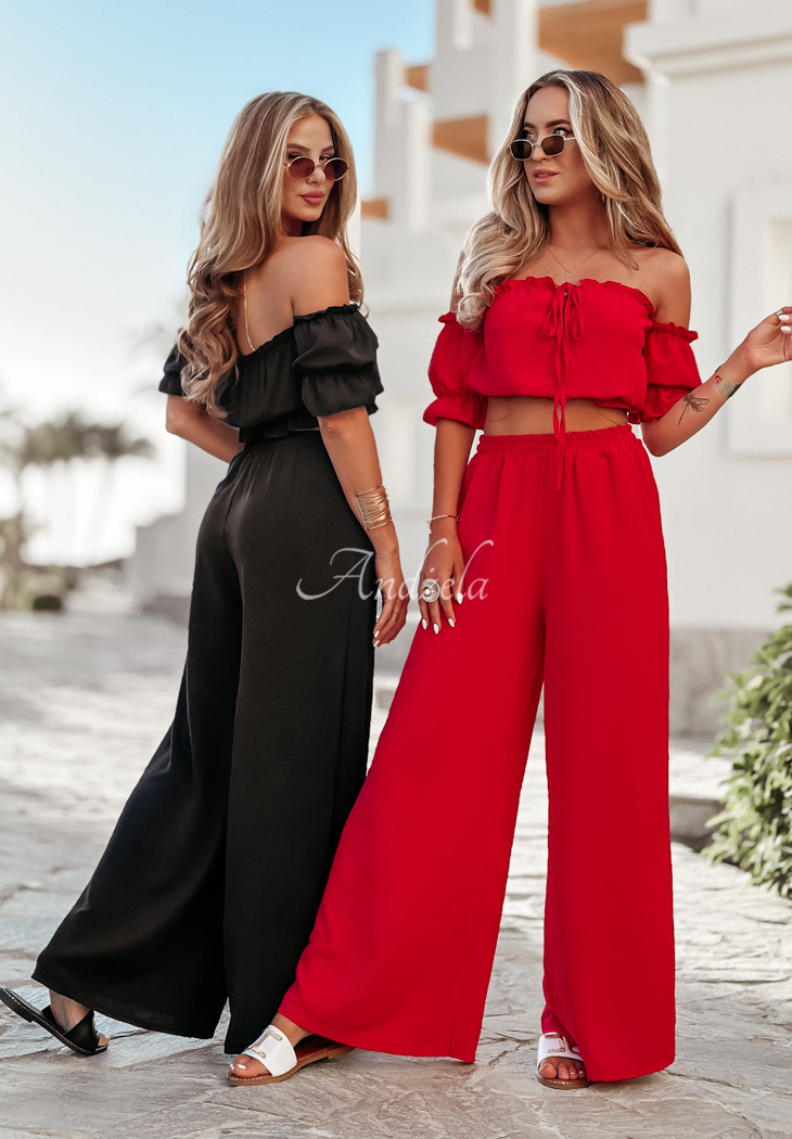 A set made of delicate, airy fabric is an excellent choice as a base for many looks. The blouse with elastic bands at the shoulders and at the bottom has short sleeves with ribbed cuffs and a tie at the neckline. The wide-leg pants have pockets on the side, and there is a sewn-in elastic waistband. Available in several color versions.