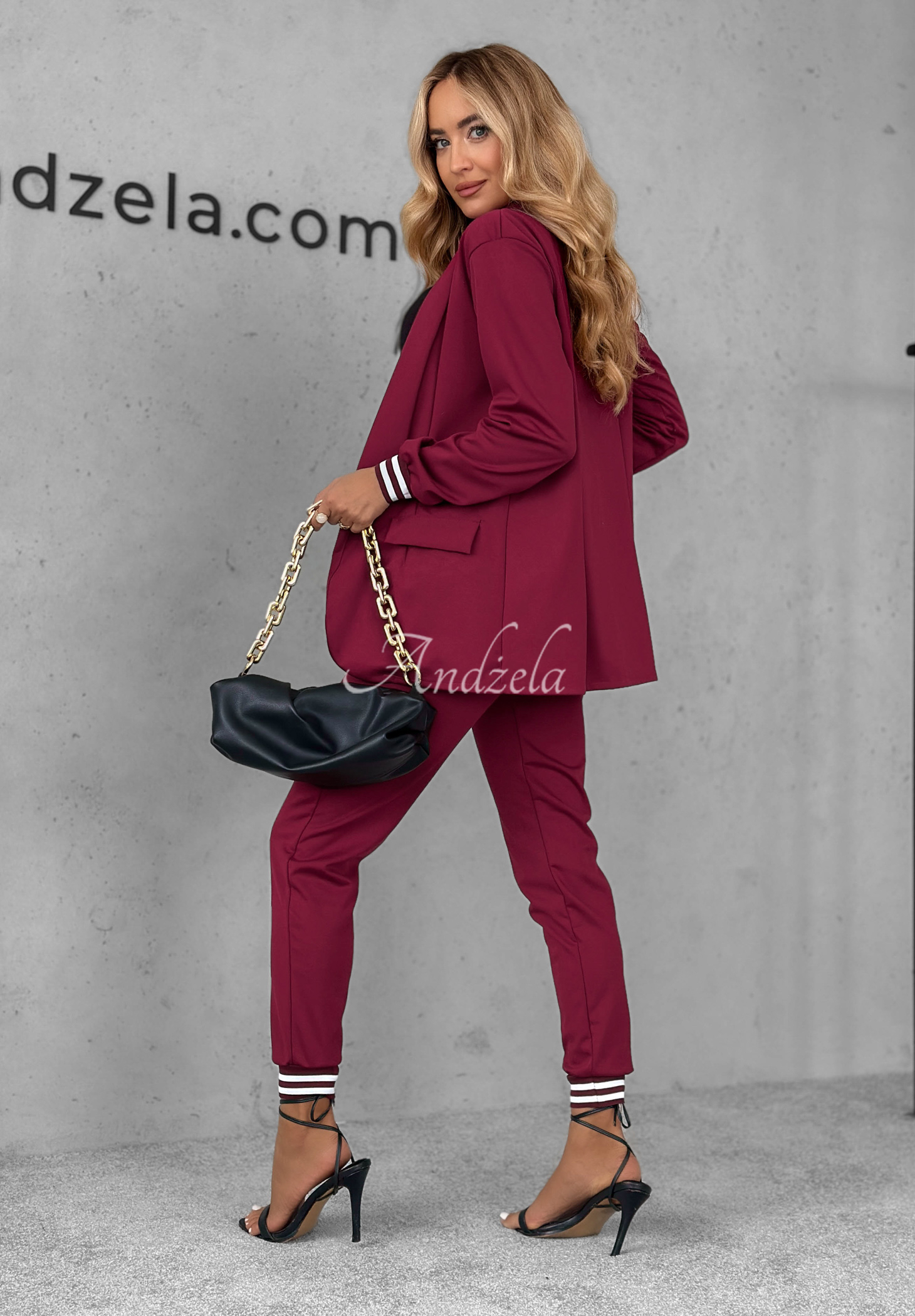 The track suit is a perfect proposition for the modern woman who opts for comfortable solutions. The unbuttoned jacket has imitation pockets, and its sleeves are finished with a ribbed hem, as are the bottom legs. The pants have an elastic waistband, thanks to which they fit the figure perfectly. The whole set combines sporty and elegant style, which together looks really phenomenal. This set will work fantastically both for everyday wear and for formal outings.