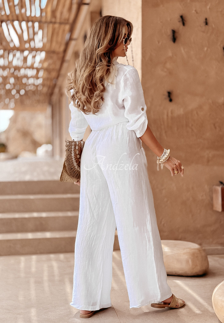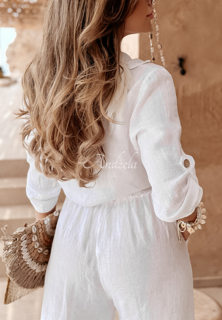 Short shirt made of high-quality linen fabric. It is buttoned, has sleeves that are gently adjustable in length and ties at the front. At the height of the bust there is a pocket. This proposition will be perfect for any summer closet and will fit perfectly into everyday looks.