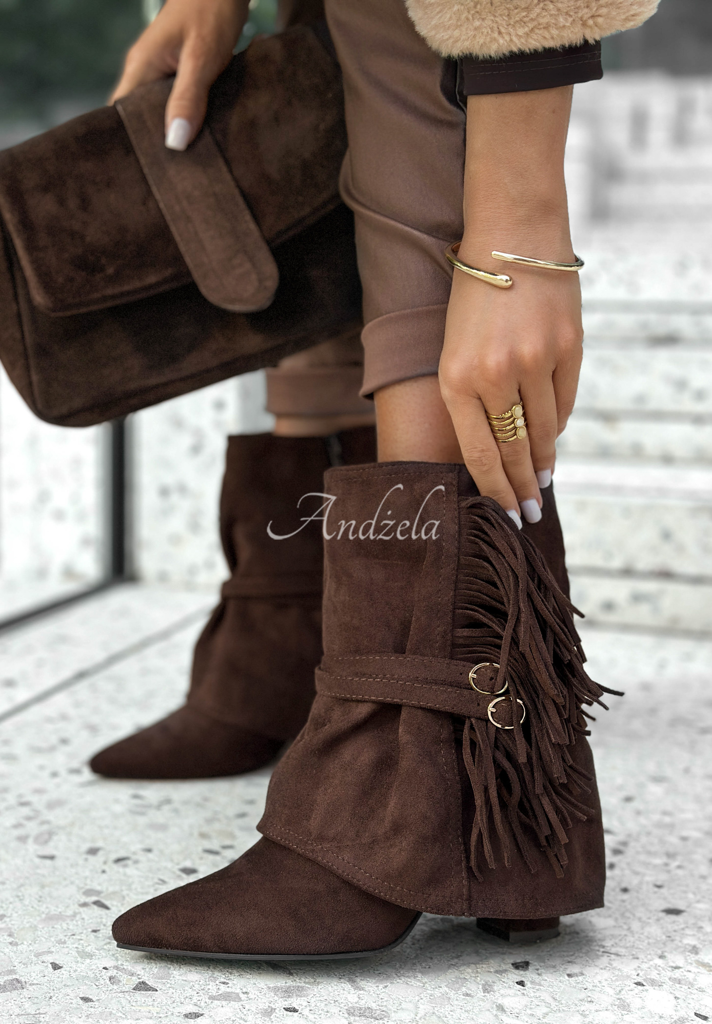 Suede boots set on a higher post. This model is distinguished by additional material with tassels, as well as small straps with buckles. This is a model with an ankle-length upper and a pointed toe. Fastened with a zipper located on the side.