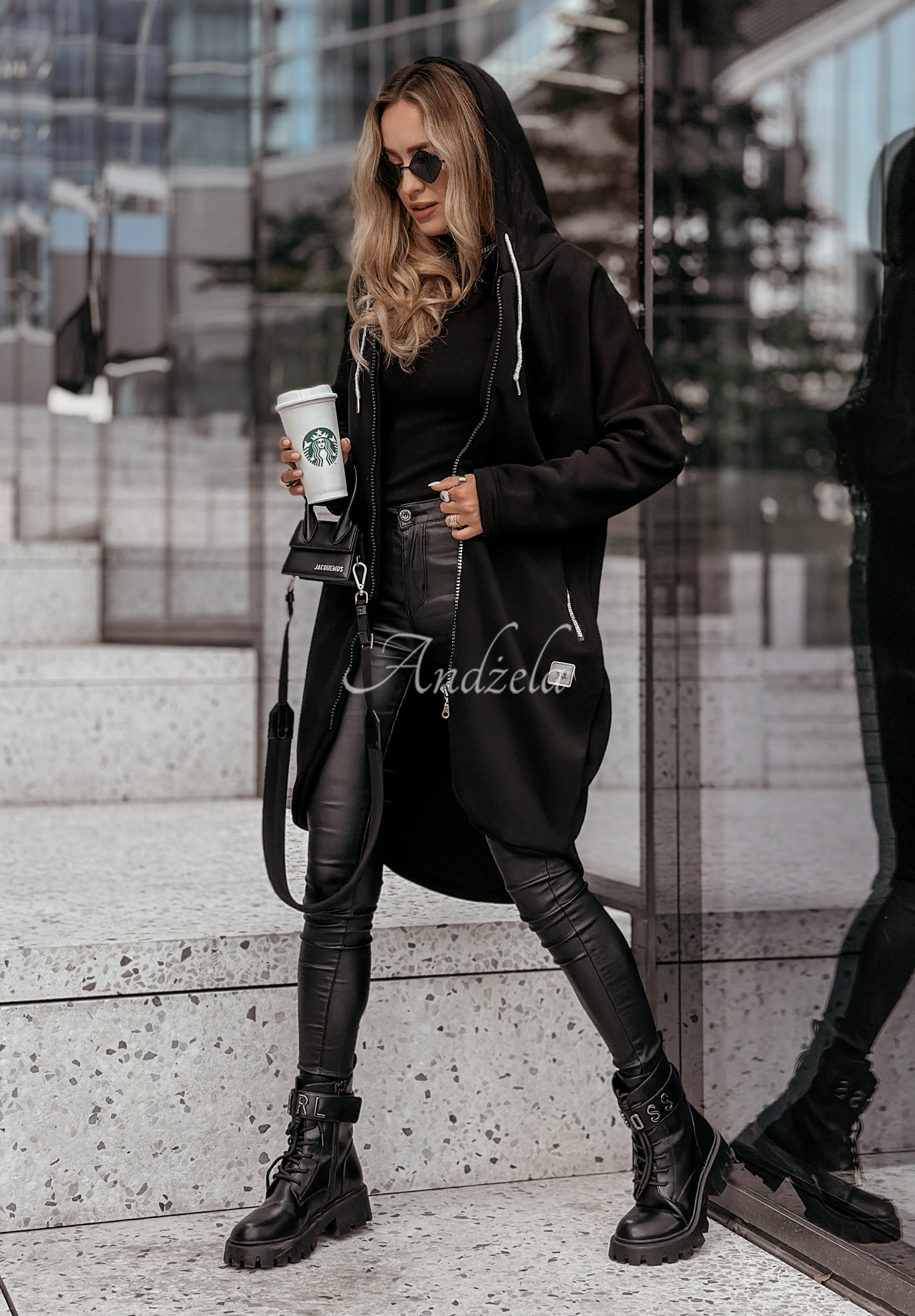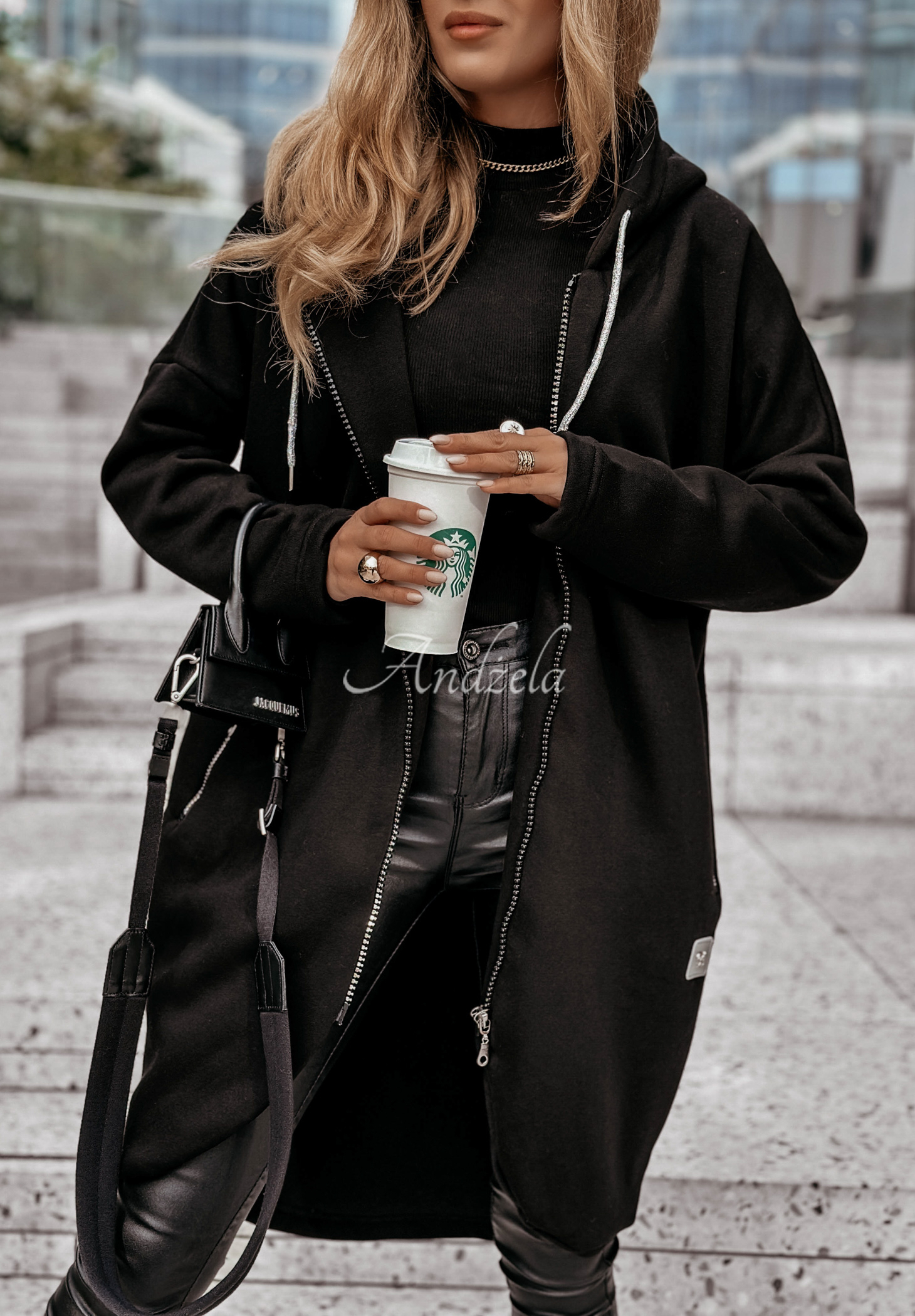 The long cotton sweatshirt is a great choice for comfortable styling. The whole piece is insulated, so it will be great for colder days. It is a slightly asymmetrical model with a hood, and it is fastened with a zipper. It has long sleeves, and there are functional zippered pockets on the front.