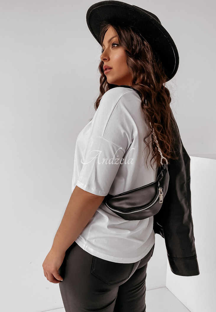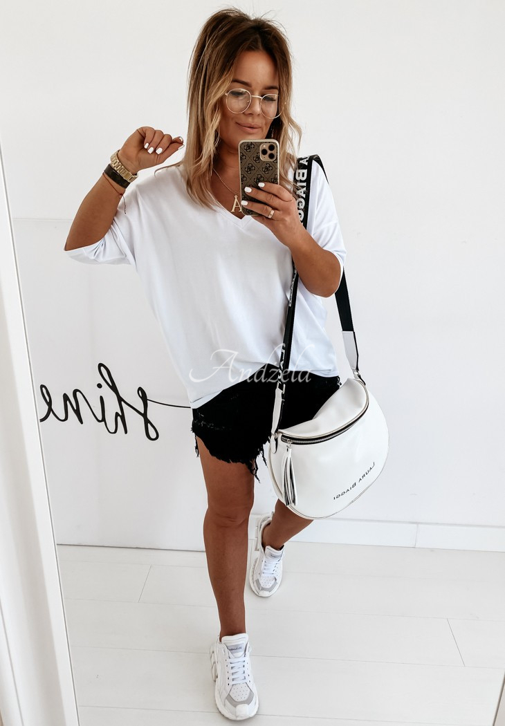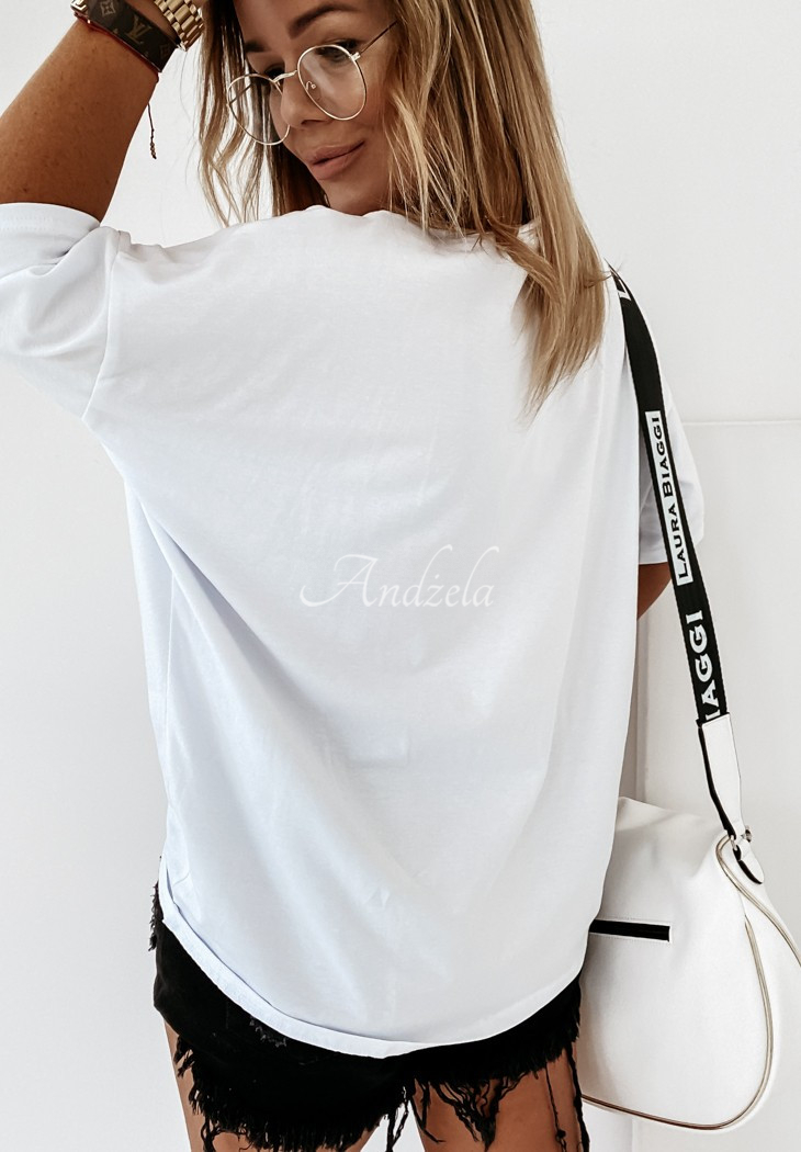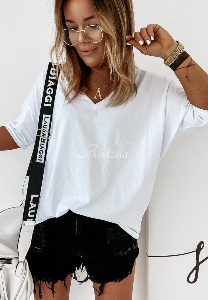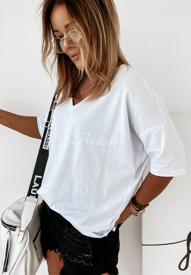 Cotton T-shirt with an oversized cut is a perfect base for everyday as well as sporty styling. The model with a lowered shoulder line and a heart-shaped neckline, will go well with jeans and sports shoes. High-quality product, available in several color versions.