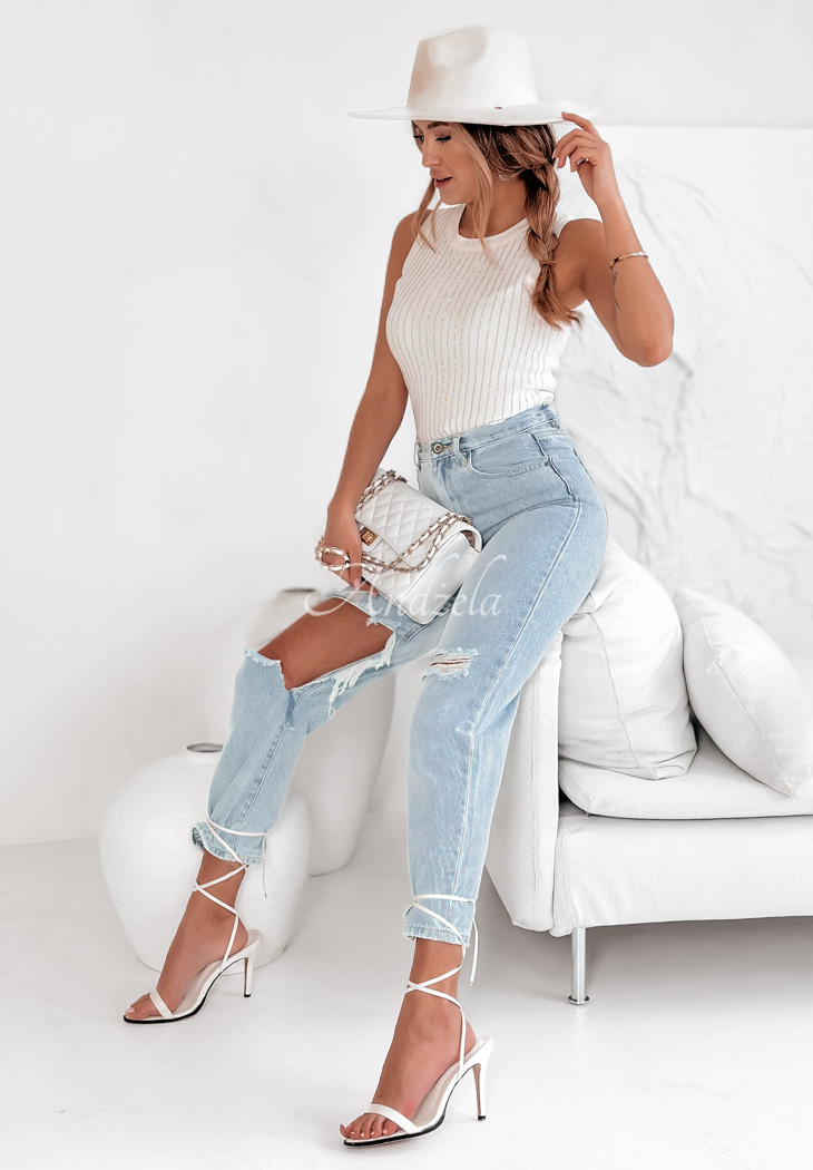 This viscose top is a great base for outfits suited to various occasions. It features a decorative appliqué on the front made of tiny silver crystals. This ribbed style with a rounded neckline fits the figure perfectly.