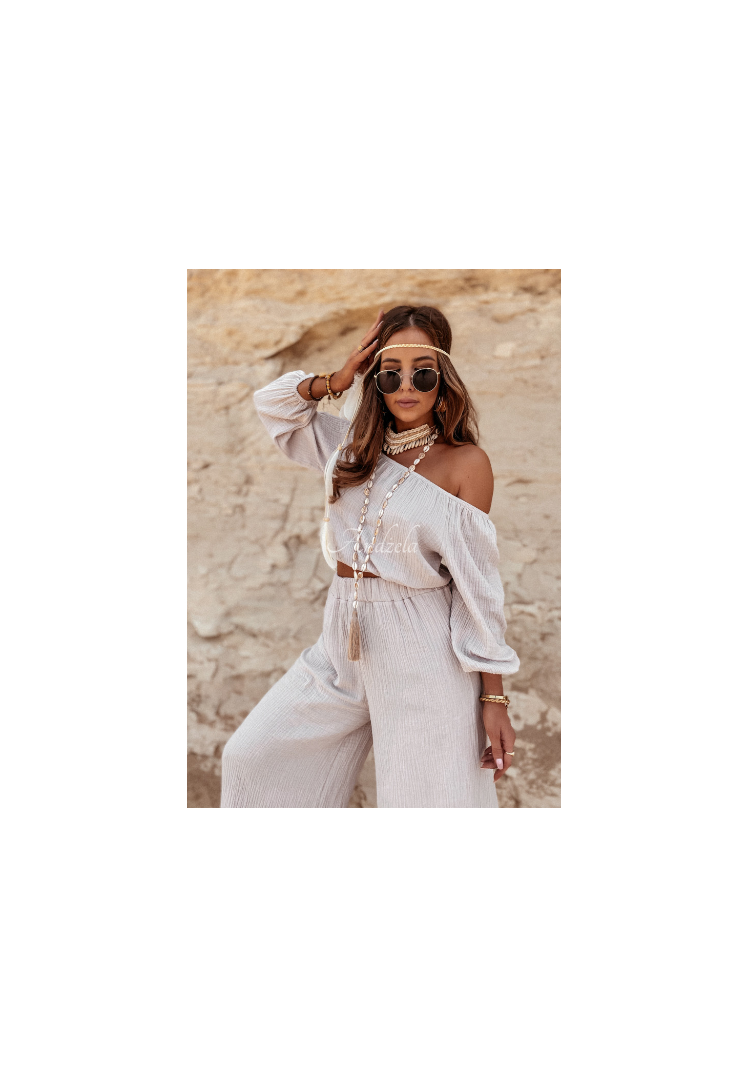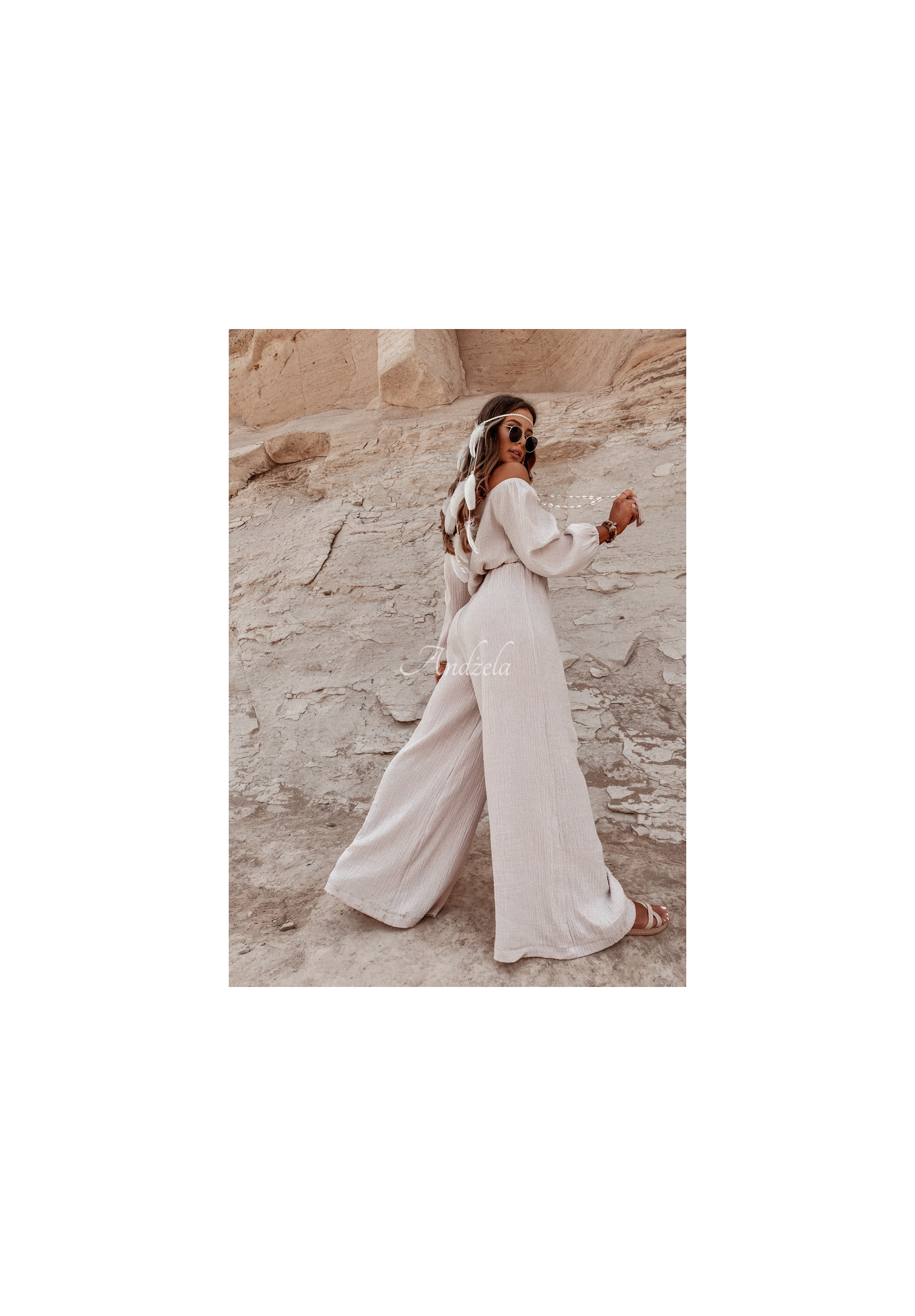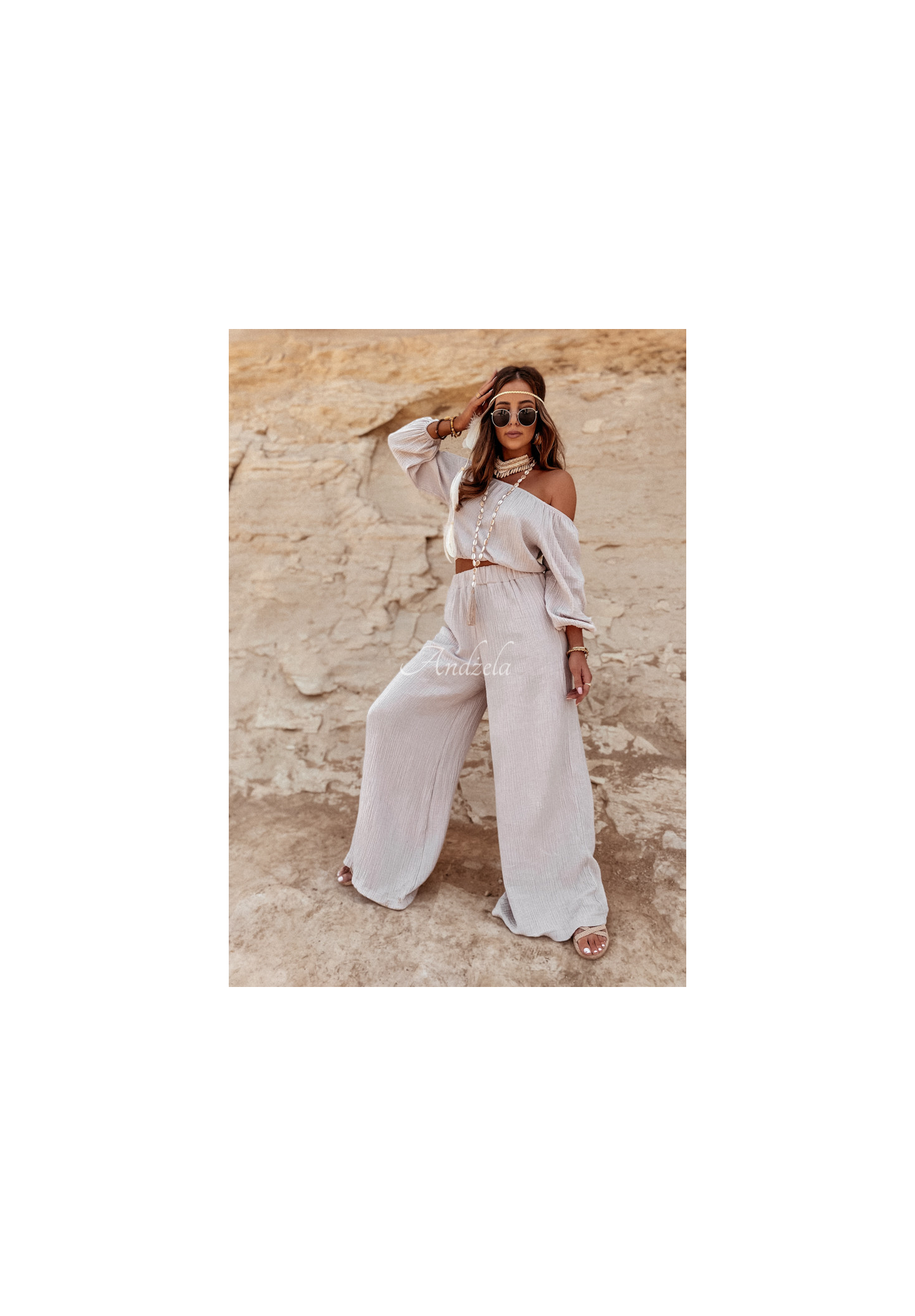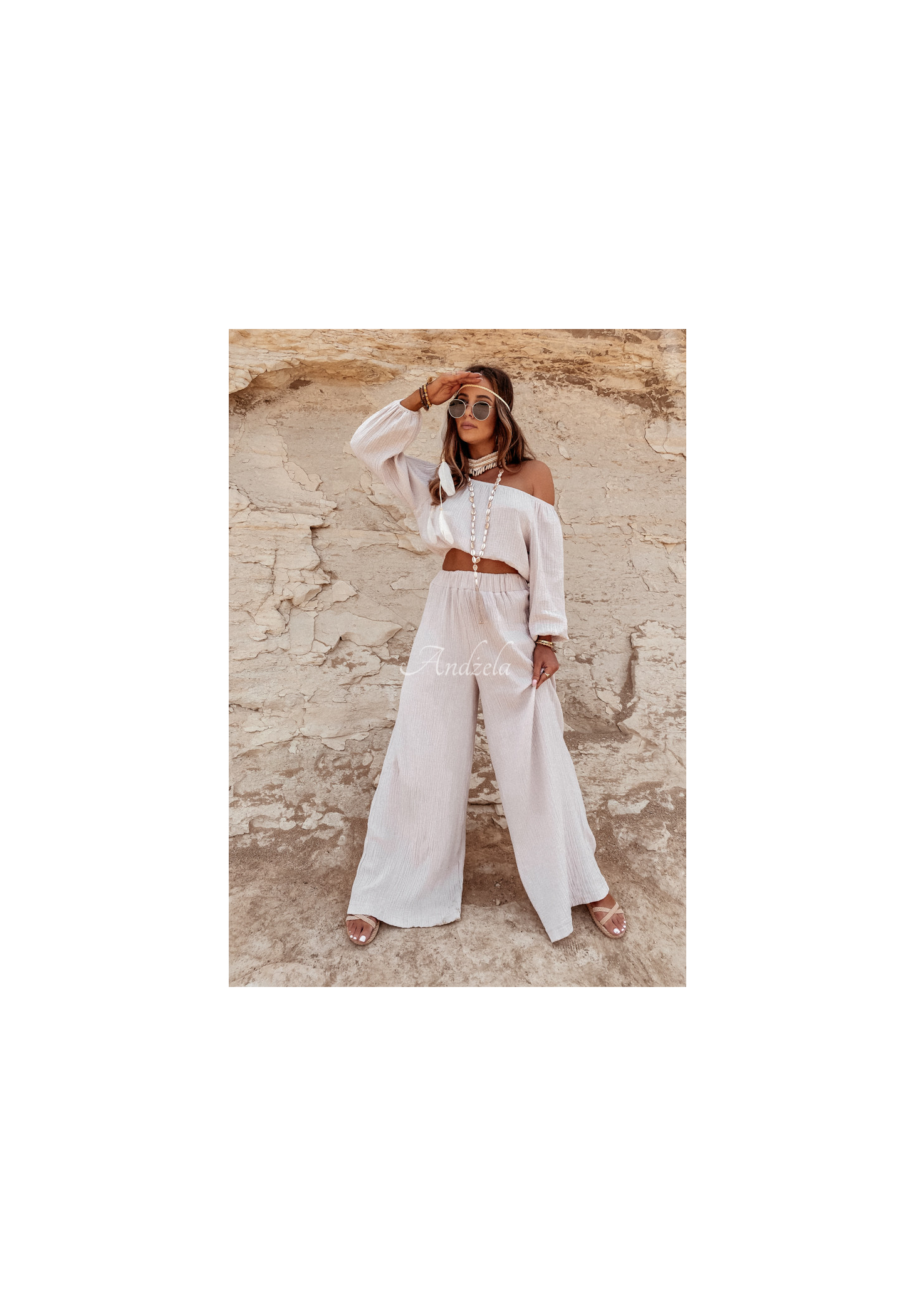 Delicate pants with wide legs and a high waist, made of high-quality muslin fabric. The model has an elastic waistband for a perfect fit. T is an ideal choice for many summer outfits, compose them with a blouse or top from the same collection and ensure a perfect vacation look! High quality product, available in several color variants. Design by ANDŻELA!