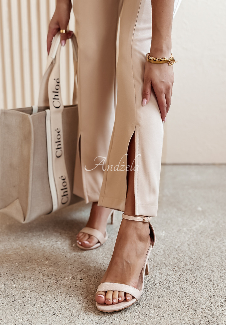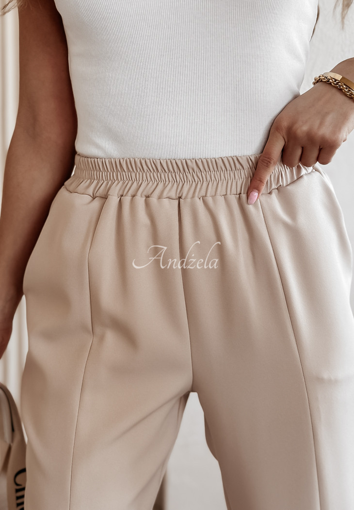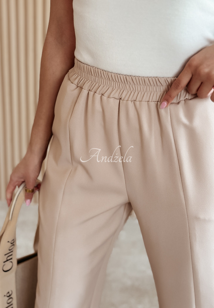 Material pants in an elegant edition are a proposal that will be perfect for styling for various occasions. They are distinguished by wide legs, in the front of which there are fashionable slits, giving the whole look lightness. This high-waisted model has functional pockets, as well as an elastic waistband for a perfect fit. Design by ANDŻELA!