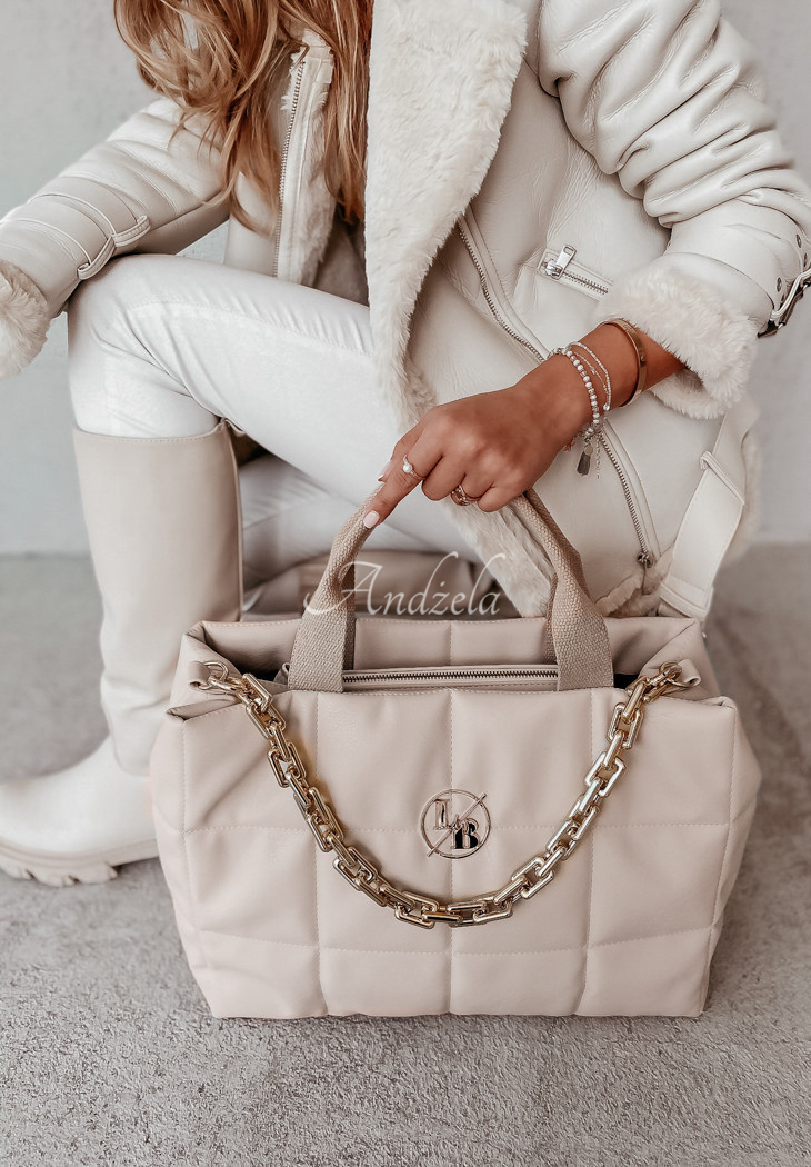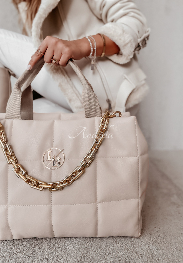 Elegant and very packable handbag made of quilted material, it will certainly be a great addition to many stylings. The model has a decorative gold chain, which gives it character. The bag has handles and an adjustable strap. Inside it has three pockets, one of which is zippered.